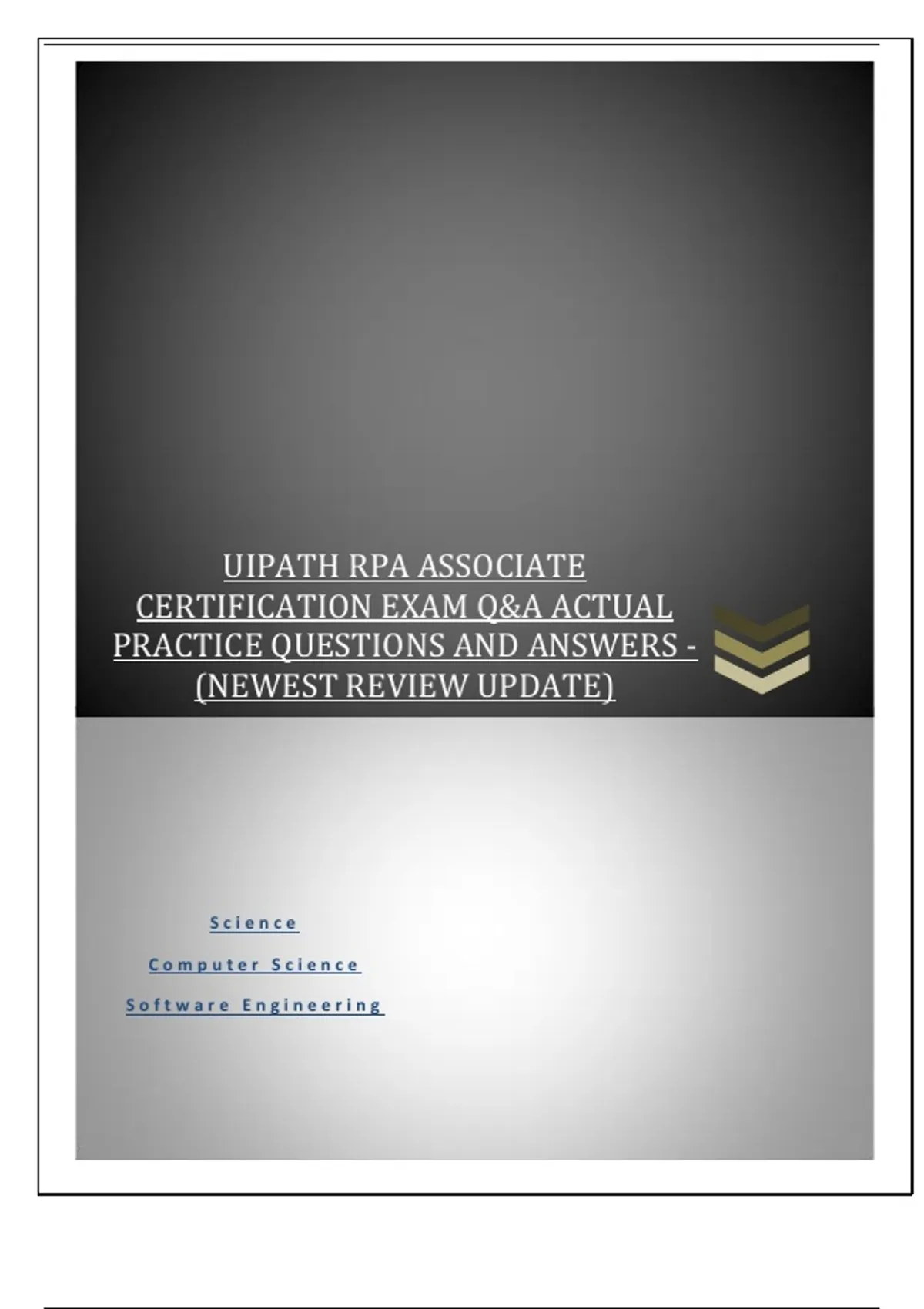 UIPATH RPA ASSOCIATE CERTIFICATION EXAM Q&A ACTUAL PRACTICE QUESTIONS AND ANSWERS - (NEWEST REVIEW UPDATE) Which function(s) is available with an attended robot? -Ability to continue execution under a locked screen -Used for debugging and testing purposes -Started from the robot try or command prompt -Responsible for remote execution, monitoring, and scheduling - Correct Answer-Started from the robot tray or command prompt. A customer calls into a Call Center to get an update on their current outstanding payment. Consider the following use case: 1. The customer provides the Customer Id to the call center representative. 2. The call center representative inputs the Customer ID into a web application. 3. Data is scraped from the web application. 4. Calculations are performed by the robot. 5. The outstanding amount is provided to the customer over the telephone by the representative. if this process is automated, what is the minimum number of steps that require manual intervention? - Correct Answer-Three, because steps 3 and 4 are automated. Which type(s) of automation does UiPath support? - Correct Answer-Attended, Hybrid, and Unattended automation Which component of the UiPath platform is used to develop workflows? - Correct Answer-