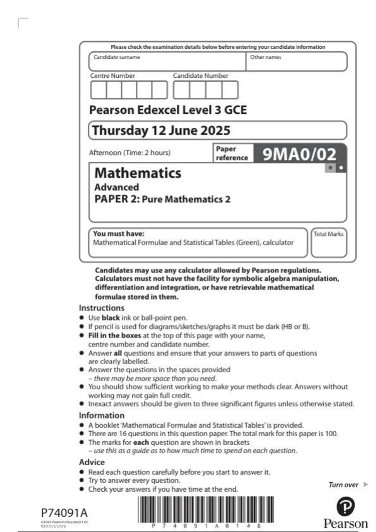 Pearson Edexcel Level 3 GCE Paper reference 9MA0/02 Mathematics Advanced PAPER 2: Pure Mathematics 2 June 2025