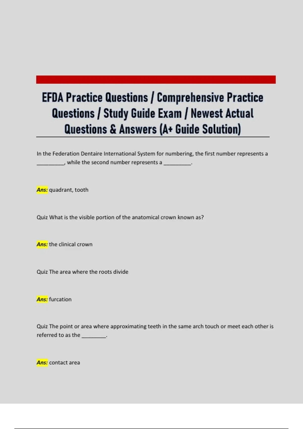 EFDA Practice Questions / Comprehensive Practice Questions / Study Guide Exam / Newest Actual Questions & Answers (A+ Guide Solution)
