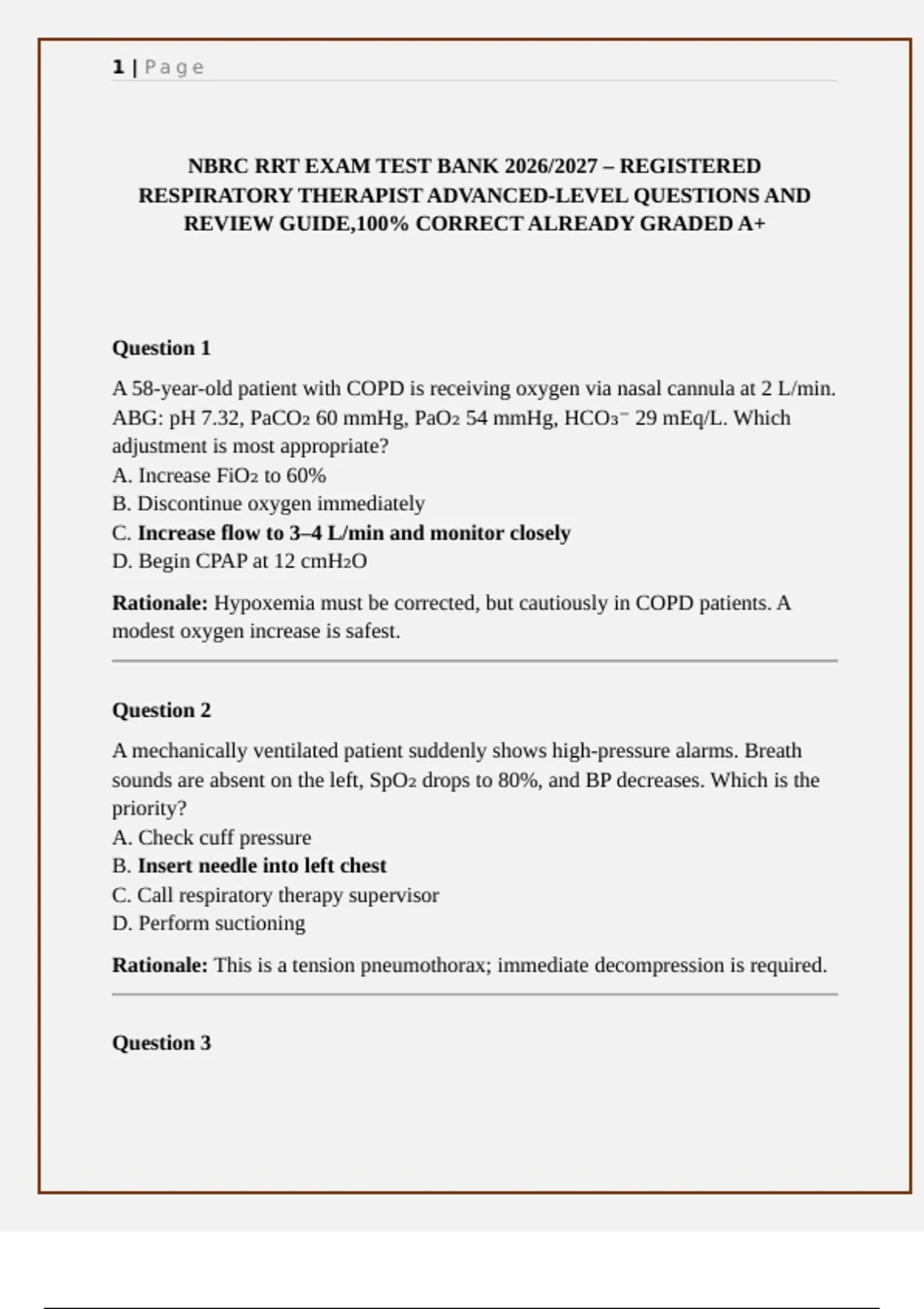 Prepare with the NBRC RRT Advanced-Level Exam Test Bank 2026/2027 (Questions 300), designed to help respiratory therapy students and professionals master exam content. This comprehensive practice guide covers mechanical ventilation, ABG interpretation, oxygen therapy, pulmonary function testing, neonatal and pediatric care, airway management, pharmacology, and critical care scenarios. Each question includes correct answers and clear explanations to strengthen clinical reasoning and exam readiness. Perfect for candidates preparing for the Registered Respiratory Therapist (RRT) credential, this review resource builds confidence with realistic exam-style questions and ensures success in both knowledge and applied clinical judgment.