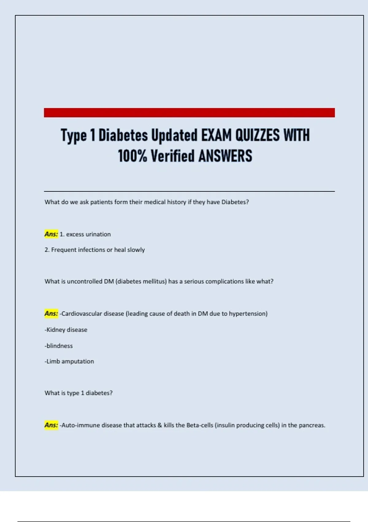 Ans: -Auto-immune disease that attacks & kills the Beta-cells (insulin producing cells) in the pancreas.