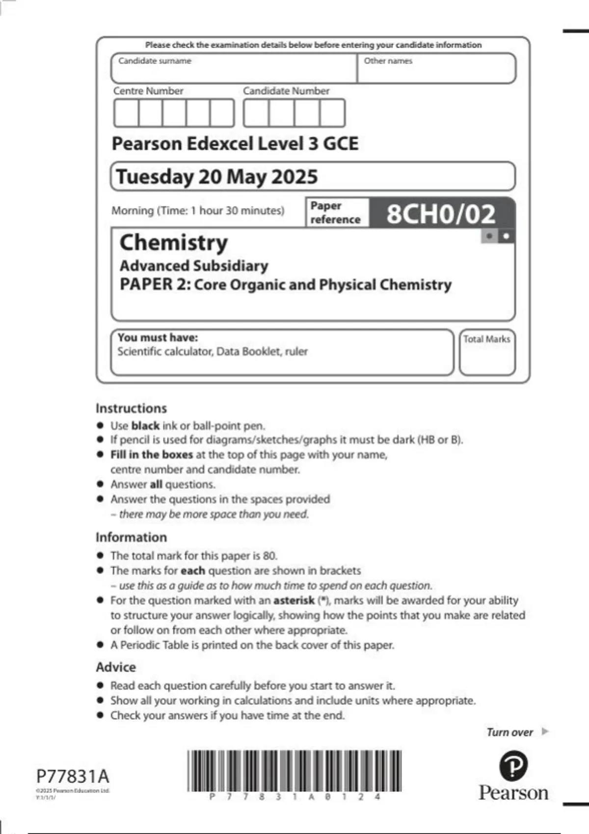 PEARSON EDEXCEL ADVANCED SUBSIDIARY LEVEL CHEMISTRY PAPER 2 JUNE 2025 FINAL QUESTION PAPER