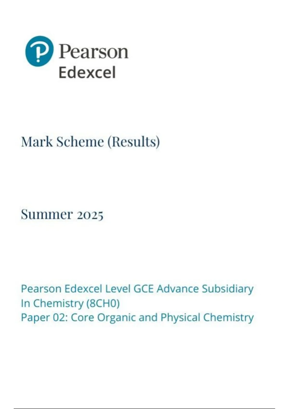 PEARSON EDEXCEL ADVANCED SUBSIDIARY LEVEL CHEMISTRY PAPER 2 JUNE 2025 FINAL MARK SCHEME