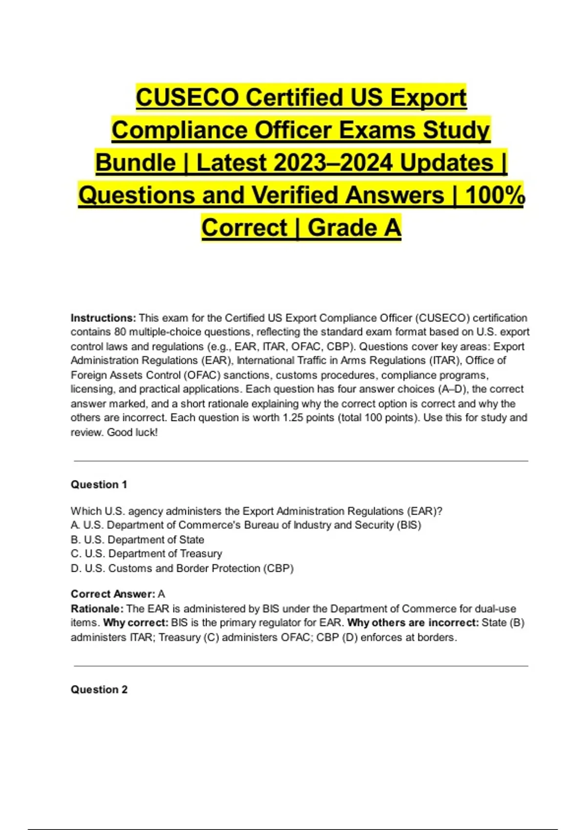 This document provides the complete study bundle for the CUSECO Certified US Export Compliance Officer Exams, updated for the 2023–2024 cycle. It contains verified questions and 100% correct answers, graded A. Topics include U.S. export regulations, ITAR, EAR, trade compliance programs, licensing, restricted party screening, and risk management. A comprehensive preparation guide to ensure success on the CUSECO certification exams.