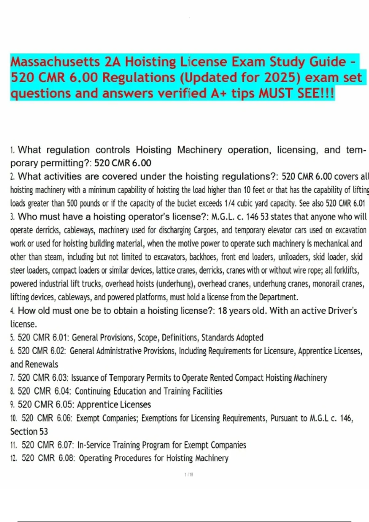 Massachusetts 2A Hoisting License Exam Study Guide – 520 CMR 6.00 Regulations (Updated for 2025) exam set questions and answers verified A+ tips MUST SEE!!!.pdf