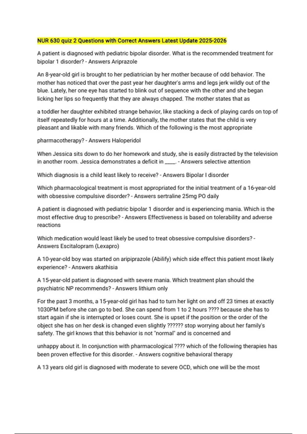 NUR 630 quiz 2 Questions with Correct Answers Latest Update A patient is diagnosed with pediatric bipolar disorder. What is the recommended treatment for bipolar 1 disorder? - Answers Ariprazole An 8-year-old girl is brought to her pediatrician by her mother because of odd behavior. The mother has noticed that over the past year her daughter's arms and legs jerk wildly out of the blue. Lately, her one eye has started to blink out of sequence with the other and she began licking her lips so frequently that they are always chapped. The mother states that as a toddler her daughter exhibited strange behavior, like stacking a deck of playing cards on top of itself repeatedly for hours at a time. Additionally, the mother states that the child is very pleasant and likable with many friends. Which of the following is the most appropriate pharmacotherapy? - Answers Haloperidol When Jessica sits down to do her homework and study, she is easily distracted by the television in another room. Jessica demonstrates a deficit in ____. - Answers selective attention Which diagnosis is a child least likely to receive? - Answers Bipolar I disorder Which pharmacological treatment is most appropriated for the initial treatment of a 16-year-old with obsessive compulsive disorder? - Answers sertraline 25mg PO daily A patient is diagnosed with pediatric bipolar 1 disorder and is experiencing mania. Which is the most effective drug to prescribe? - Answers Effectiveness is based on tolerability and adverse reactions Which medication would least likely be used to treat obsessive compulsive disorders? - Answers Escitalopram (Lexapro) A 10-year-old boy was started on aripiprazole (Abilify) which side effect this patient most likely experience? - Answers akathisia A 15-year-old patient is diagnosed with severe mania. Which treatment plan should the psychiatric NP recommends? - Answers lithium only For the past 3 months, a 15-year-old girl has had to turn her light on and off 23 times at exactly 1030PM before she can go to bed. She can spend from 1 to 2 hours ???? because she has to start again if she is interrupted or loses count. She is upset if the position or the order of the object she has on her desk is changed even slightly ?????? stop worrying about her family's safety. The girl knows that this behavior is not "normal" and is concerned and unhappy about it. In conjunction with pharmacological ???? which of the following therapies has been proven effective for this disorder. - Answers cognitive behavioral therapy A 13 years old girl is diagnosed with moderate to severe OCD, which one will be the most appropriate treatment to start treating her condition: - Answers cognitive behavioral therapy The only SSRI that is currently FDA approved for the treatment of depression in children is: - Answers prozac The brain system associated with anxiety is called ____. - Answers BIS Behavioral inhibition system To be diagnosed with generalized anxiety disorder, a child must exhibit ____. - Answers an