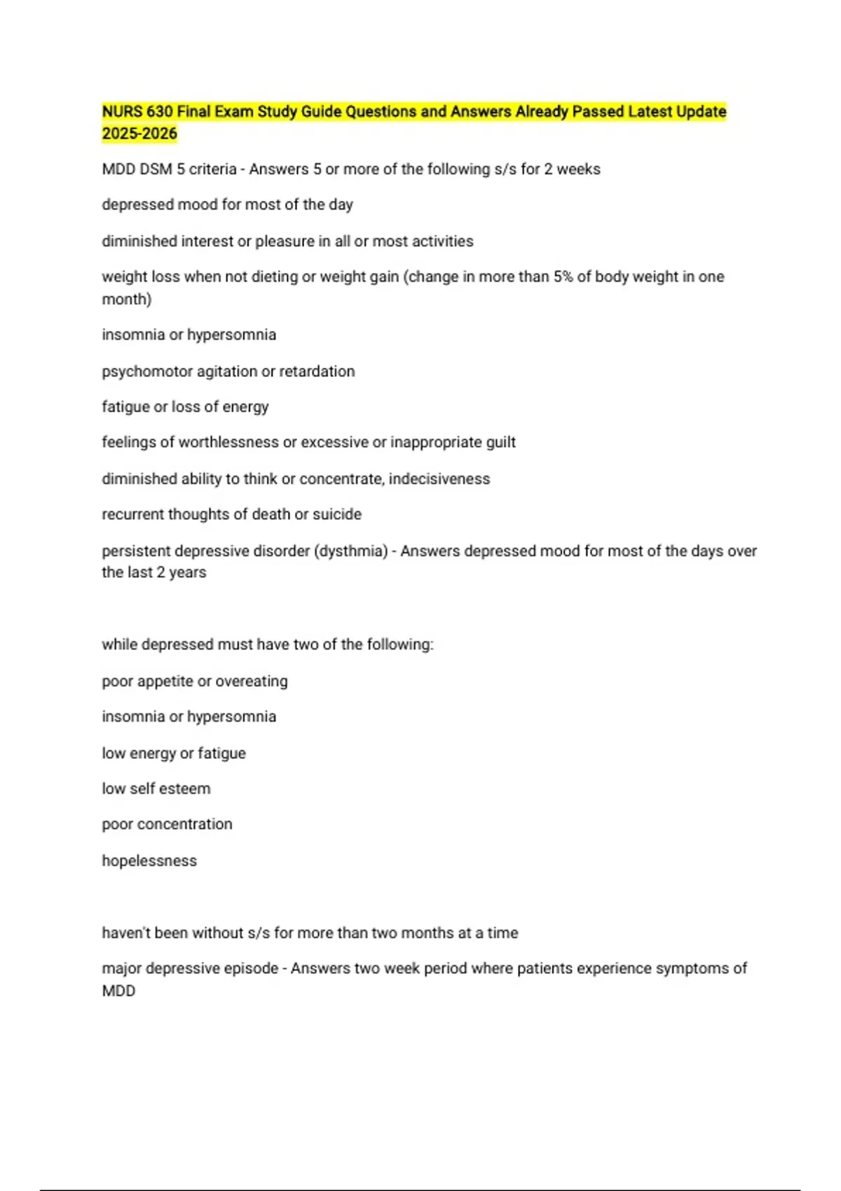 NURS 630 Final Exam Study Guide Questions and Answers Already Passed Latest Update MDD DSM 5 criteria - Answers 5 or more of the following s/s for 2 weeks depressed mood for most of the day diminished interest or pleasure in all or most activities weight loss when not dieting or weight gain (change in more than 5% of body weight in one month) insomnia or hypersomnia psychomotor agitation or retardation fatigue or loss of energy feelings of worthlessness or excessive or inappropriate guilt diminished ability to think or concentrate, indecisiveness recurrent thoughts of death or suicide persistent depressive disorder (dysthmia) - Answers depressed mood for most of the days over the last 2 years while depressed must have two of the following: poor appetite or overeating insomnia or hypersomnia low energy or fatigue low self esteem poor concentration hopelessness haven't been without s/s for more than two months at a time major depressive episode - Answers two week period where patients experience symptoms of MDD cyclothymic disorder - Answers at least 2 years there have been numerous hypomanic s/s that do not meet criteria for hypomanic episodes and numerous periods of depressive s/s that don't meet criteria for major depression if a patient presents with increased energy, grandiose thought process, and AVH, can they be diagnosed with biploar II? - Answers no, psychotic features automatically defer to a bipolar I dx hypomanic symptoms - Answers distinct period of elevated, expansive, or irritable mood with increased energy lasting at least 4 days three of more s/s: inflated self esteem/grandiosity decreased need for sleep more talkative than normal or pressured speech flight of ideas or racing thoughts distractibility increase in goal directed activity involvement in activities that have high likelihood for painful consequences hypomania causes marked impairment on functioning - Answers false manic episode - Answers elevated, expansive, or irritable mood lasting at least 1 week chorea - Answers excessive, spontaneous movements that are irregularly timed, nonrepetitive, random, and abrupt not rhythmic myoclonus - Answers involuntary muscle contraction consisting of lighting like movements or a specific muscle or muscle group quick simple jerk dystonia - Answers involuntary muscle contractions causing twisting or repetitive movements, abnormal postures, or both akathesia - Answers inability to remain still feeling restless, agitated, a need to pace affect - Answers appearance of observable emotions dysarthria - Answers difficulty speaking bc muscles in mouth too weak Aprosodia - Answers inability to understand changes in tone of voice or pitch used to relay information in linguistics or emotional information illusion - Answers perception that occurs when a stimulus is present but is misinterpreted trust vs mistrust - Answers infancy (0-1 yo) trust (or mistrust) of basic, needs such as nourishment or affection, will be met autonomy vs shame/doubt - Answers early childhood (1-3 yo) develop sense of independence initiative vs guilt - Answers play age (3-6 yo) take initiative on activities and may be guilty if unsuccessful industry vs inferiority - Answers school age (7-11 yo) develops self confidence when confident and inferiority when not successful identity vs confusion - Answers adolescents (12-18 yo) develop identity and roles intimacy vs isolation - Answers early adulthood (19-29 yo) establish intimacy and relationships with others generativity vs stagnation - Answers middle age (30-64 yo) contribute to society and family integrity vs despair - Answers old age (65+) make sense of life and contributions social anxiety disorder DSM 5 - Answers marked fear of anxiety about a social situation patient fears they will act in a way that anxiety will be negatively evaluated