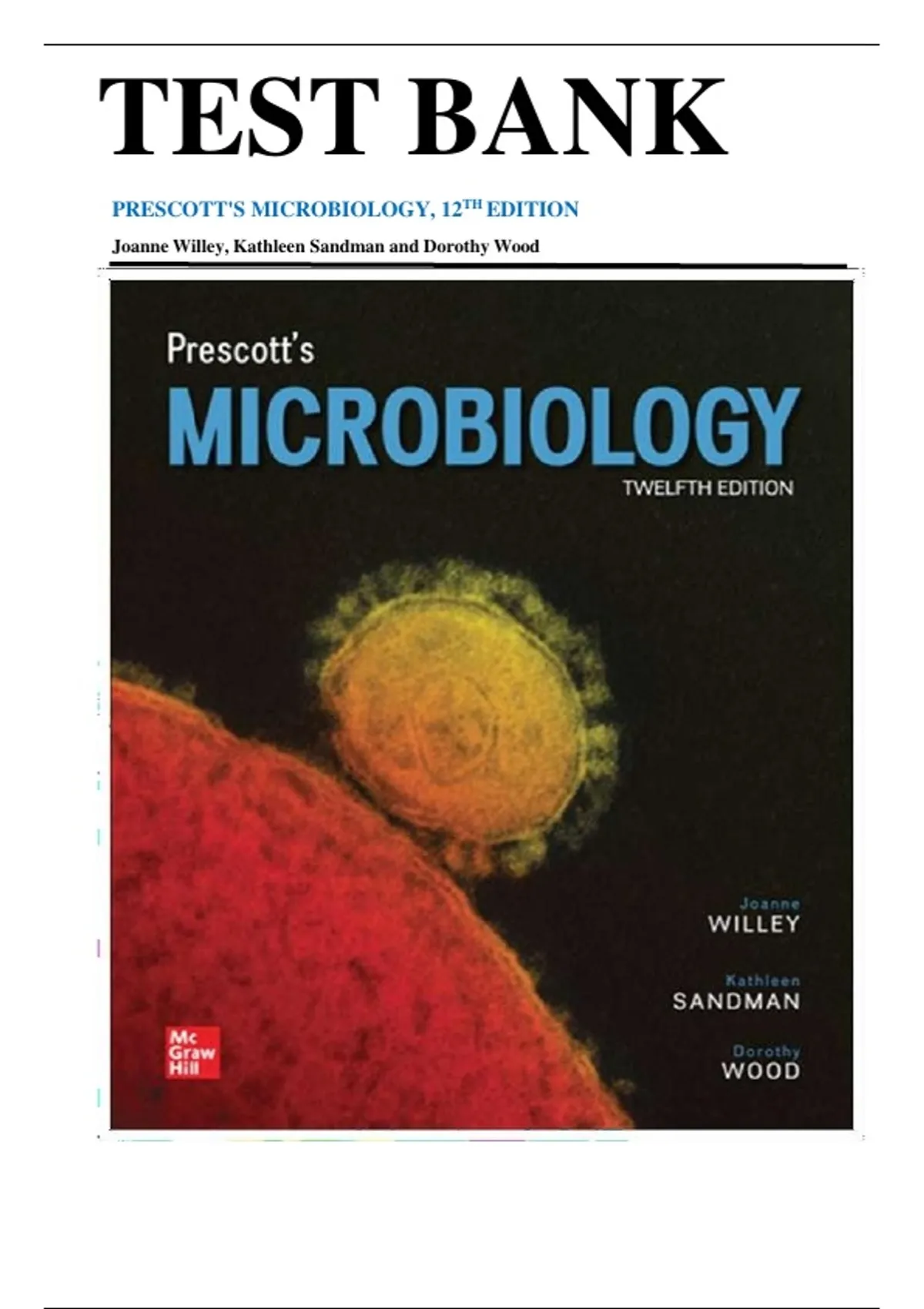 This document contains the official test bank for Prescott’s Microbiology (12th Edition) by Joanne Willey, Kathleen Sandman, and Dorothy Wood. It includes multiple choice, true/false, matching, and applied problem questions for all textbook chapters, each with verified answers. The test bank covers key microbiology concepts such as microbial evolution, taxonomy, cell structure, metabolism, genetics, immunology, virology, pathogenesis, and applied microbiology. It is a comprehensive resource for exam preparation and practice, fully aligned with the textbook structure.