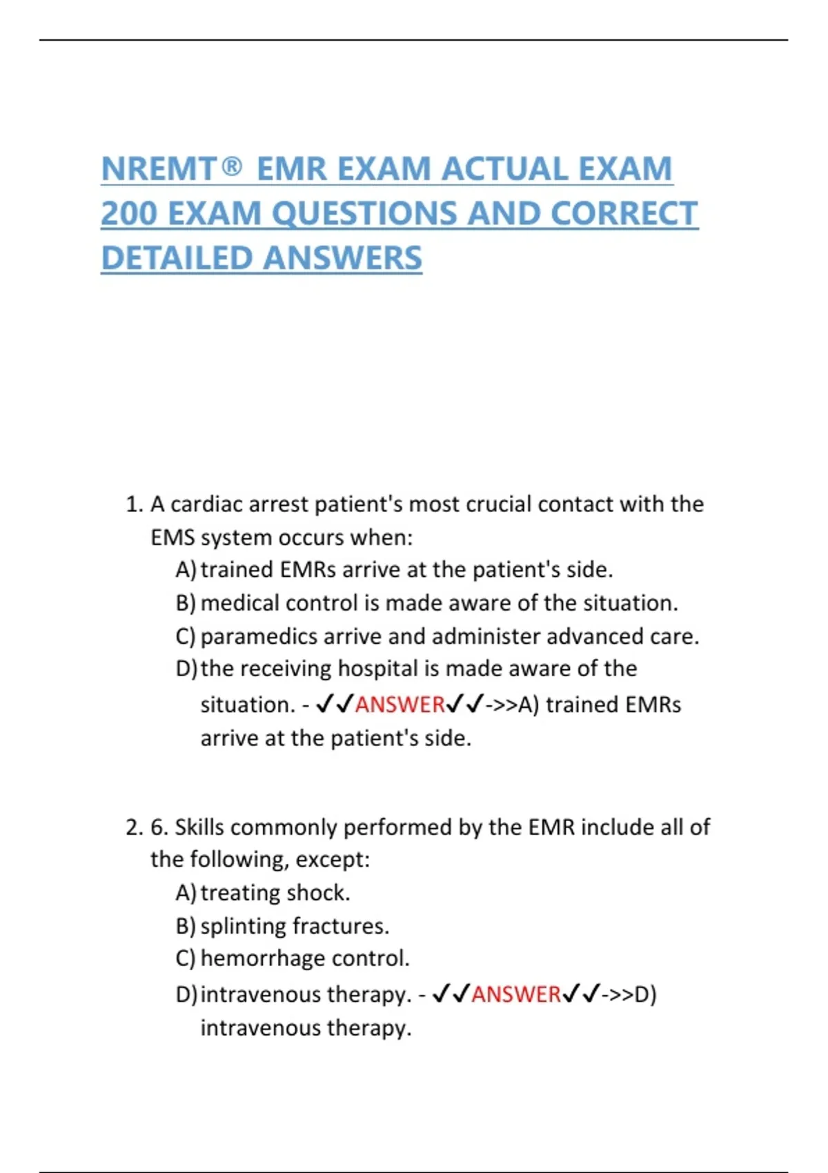 NREMT® EMR EXAM ACTUAL EXAM 200 EXAM QUESTIONS AND CORRECT DETAILED ANSWERS