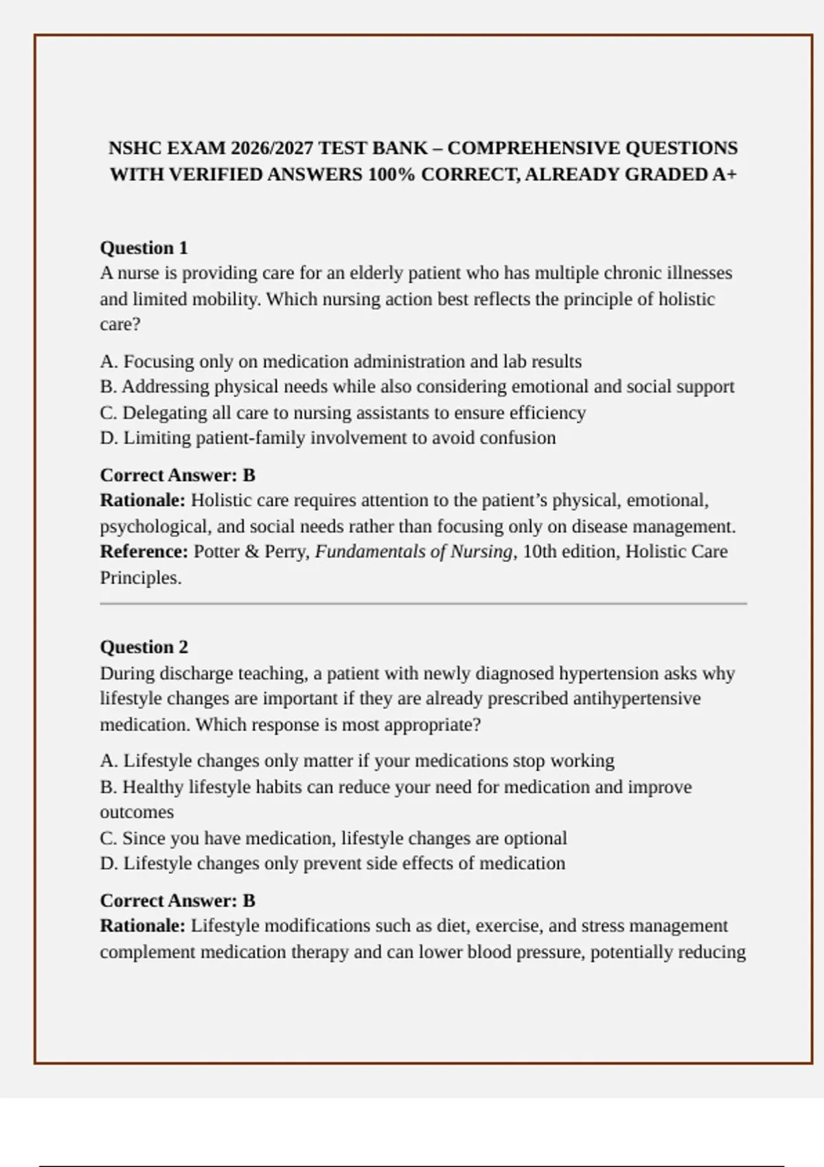 Download the NSHC Exam 2025/2026 Test Bank with 160+ verified questions and detailed rationales. Includes multiple-choice questions, correct answers, and references for nursing exam preparation. Perfect for students seeking full practice material for NSHC certification.