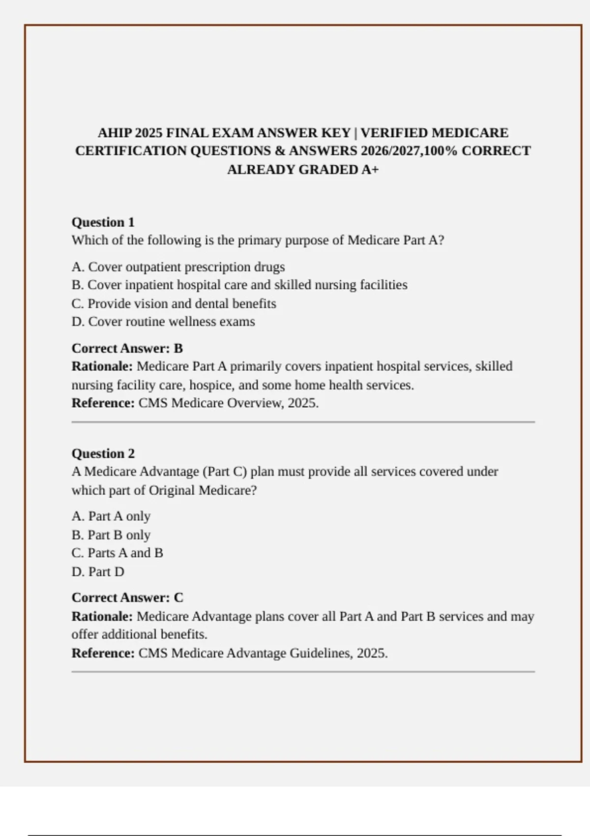 Get the complete AHIP 2025 Final Exam Answer Key with verified answers, detailed rationales, and CMS references. Covers Medicare Parts A, B, C, D, Medigap, preventive services, fraud prevention, enrollment periods, and Medicare Advantage plans. Perfect for 2025/2026 certification prep.