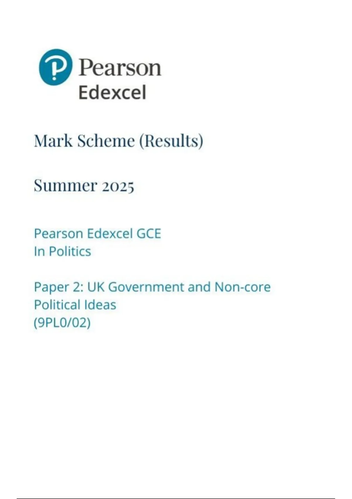 Pearson Edexcel GCE In Politics Paper 2: UK Government and Non-core Political Ideas (9PL0/02) mark scheme June 2025