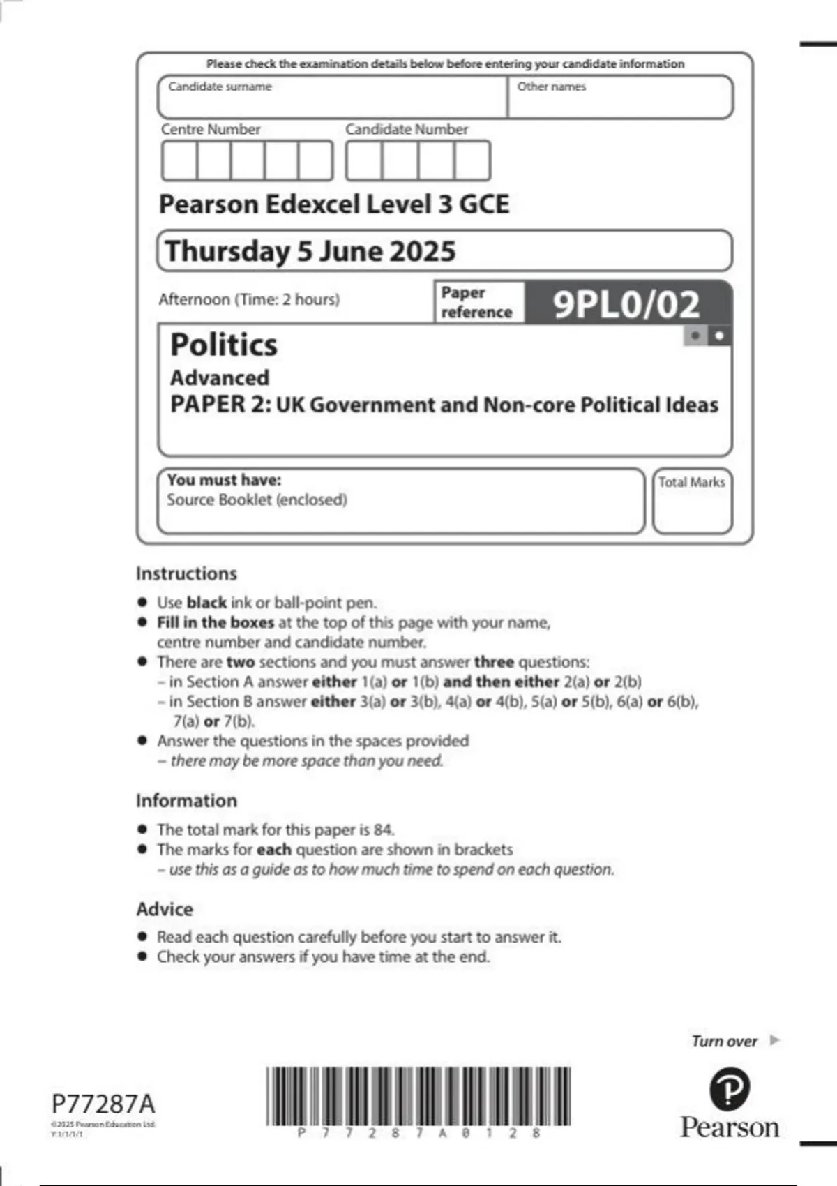 Pearson Edexcel Level 3 GCE Politics Advanced 9PL0/02 PAPER 2: UK Government and Non-core Political Ideas question paper June 2025
