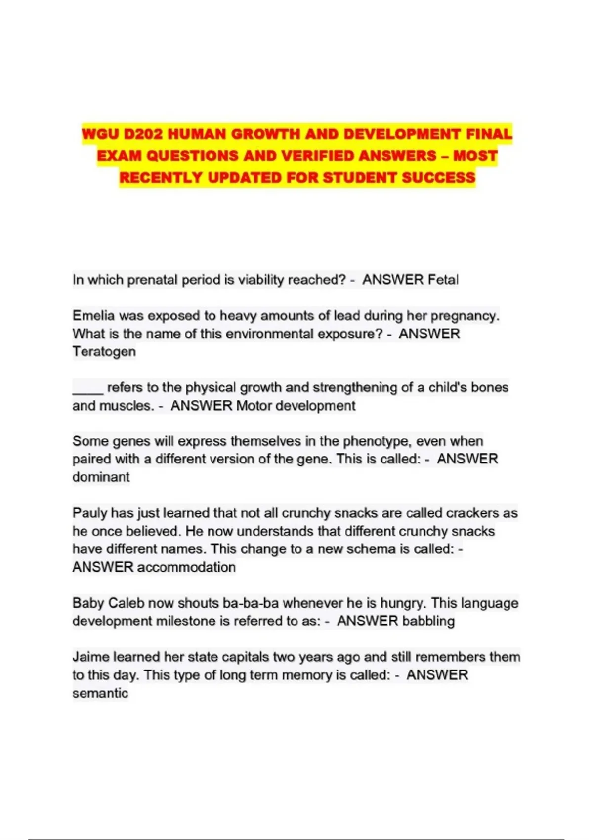 WGU D202 HUMAN GROWTH AND DEVELOPMENT FINAL EXAM QUESTIONS AND VERIFIED ANSWERS – MOST RECENTLY UPDATED FOR STUDENT SUCCESS