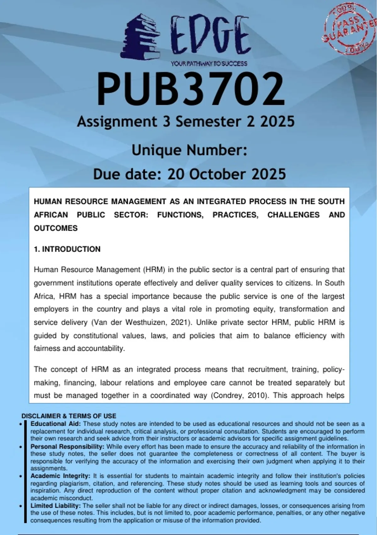 Well-structured PUB3702 Assignment 2 (ANSWERS) Semester 2 2025 - DISTINCTION GUARANTEED. (DETAILED ANSWERS - DISTINCTION GUARANTEED!)..... Assuming that the human resource function also has a management perspective, what do you suppose this implies?  What does the word “public“ mean in the term “public sector human resource management”?  Identify the different resources for the public sector human resource management function and explain how it can be utilised in the human resource management process.  Would you say that the human resource function is the sole responsibility of those working in the human resource office?  Discuss and evaluate human resources management as an integrated process in public organisations in South Africa. You may use examples or case studies. List and explain the network of functions and practices, management tasks, additional management skills and outcomes and indicate how they are integrated in the human resource process.The above are definitions of human resource management from six different sources. Compile your own definition of public sector human resource management using these examples. Pages 5 to 6 of Van der Westhuizen and Wessels (2011) describe the management perspective of human resource management in the public sector. Read it through and then do the following: Discuss and evaluate human resources management as an integrated process in public organisations in South Africa. You may use examples or case studies.  Write down the main elements of the management perspective and describe how they relate to the public sector human resource functionAssuming that the human resource function also has a management perspective, what do you suppose this implies?  What does the word “public“ mean in the term “public sector human resource management”?  Identify the different resources for the public sector human resource management function and explain how it can be utilised in the human resource management process.  Would you say that the human resource function is the sole responsibility of those working in the human resource office?  Discuss and evaluate human resources management as an integrated process in public organisations in South Africa. You may use examples or case studies. List and explain the network of functions and practices, management tasks, additional management skills and outcomes and indicate how they are integrated in the human resource process.The above are definitions of human resource management from six different sources. Compile your own definition of public sector human resource management using these examples. Pages 5 to 6 of Van der Westhuizen and Wessels (2011) describe the management perspective of human resource management in the public sector. Read it through and then do the following: Discuss and evaluate human resources management as an integrated process in public organisations in South Africa. You may use examples or case studies.  Write down the main elements of the management perspective and describe how they relate to the public sector human resource functionAssuming that the human resource function also has a management perspective, what do you suppose this implies?  What does the word “public“ mean in the term “public sector human resource management”?  Identify the different resources for the public sector human resource management function and explain how it can be utilised in the human resource management process.  Would you say that the human resource function is the sole responsibility of those working in the human resource office?  Discuss and evaluate human resources management as an integrated process in public organisations in South Africa. You may use examples or case studies. List and explain the network of functions and practices, management tasks, additional management skills and outcomes and indicate how they are integrated in the human resource process.The above are definitions of human resource management from six different sources. Compile your own definition of public sector human resource management using these examples. Pages 5 to 6 of Van der Westhuizen and Wessels (2011) describe the management perspective of human resource management in the public sector. Read it through and then do the following: Discuss and evaluate human resources management as an integrated process in public organisations in South Africa. You may use examples or case studies.  Write down the main elements of the management perspective and describe how they relate to the public sector human resource functionAssuming that the human resource function also has a management perspective, what do you suppose this implies?  What does the word “public“ mean in the term “public sector human resource management”?  Identify the different resources for the public sector human resource management function and explain how it can be utilised in the human resource management process.  Would you say that the human resource function is the sole responsibility of those working in the human resource office?  Discuss and evaluate human resources management as an integrated process in public organisations in South Africa. You may use examples or case studies. List and explain the network of functions and practices, management tasks, additional management skills and outcomes and indicate how they are integrated in the human resource process.The above are definitions of human resource management from six different sources. Compile your own definition of public sector human resource management using these examples. Pages 5 to 6 of Van der Westhuizen and Wessels (2011) describe the management perspective of human resource management in the public sector. Read it through and then do the following: Discuss and evaluate human resources management as an integrated process in public organisations in South Africa. You may use examples or case studies.  Write down th