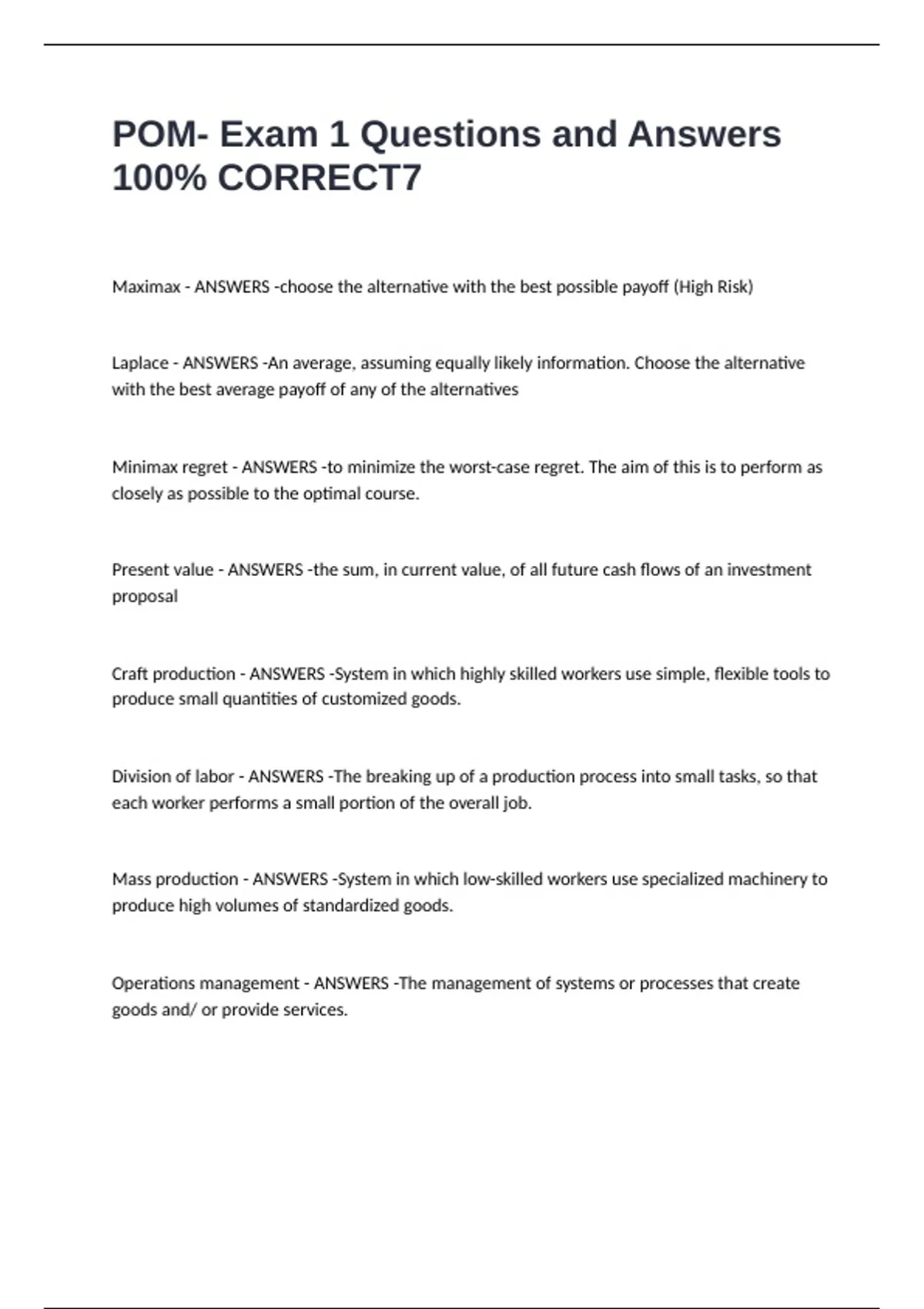 POM- Exam 1 Questions and Answers 100% CORRECT Maximax - ANSWERS -choose the alternative with the best possible payoff (High Risk) Laplace - ANSWERS -An average, assuming equally likely information. Choose the alternative with the best average payoff of any of the alternatives Minimax regret - ANSWERS -to minimize the worst-case regret. The aim of this is to perform as closely as possible to the optimal course. Present value - ANSWERS -the sum, in current value, of all future cash flows of an investment proposal Craft production - ANSWERS -System in which highly skilled workers use simple, flexible tools to produce small quantities of customized goods. Division of labor - ANSWERS -The breaking up of a production process into small tasks, so that each worker performs a small portion of the overall job. Mass production - ANSWERS -System in which low-skilled workers use specialized machinery to produce high volumes of standardized goods. Operations management - ANSWERS -The management of systems or processes that create goods and/ or provide services.