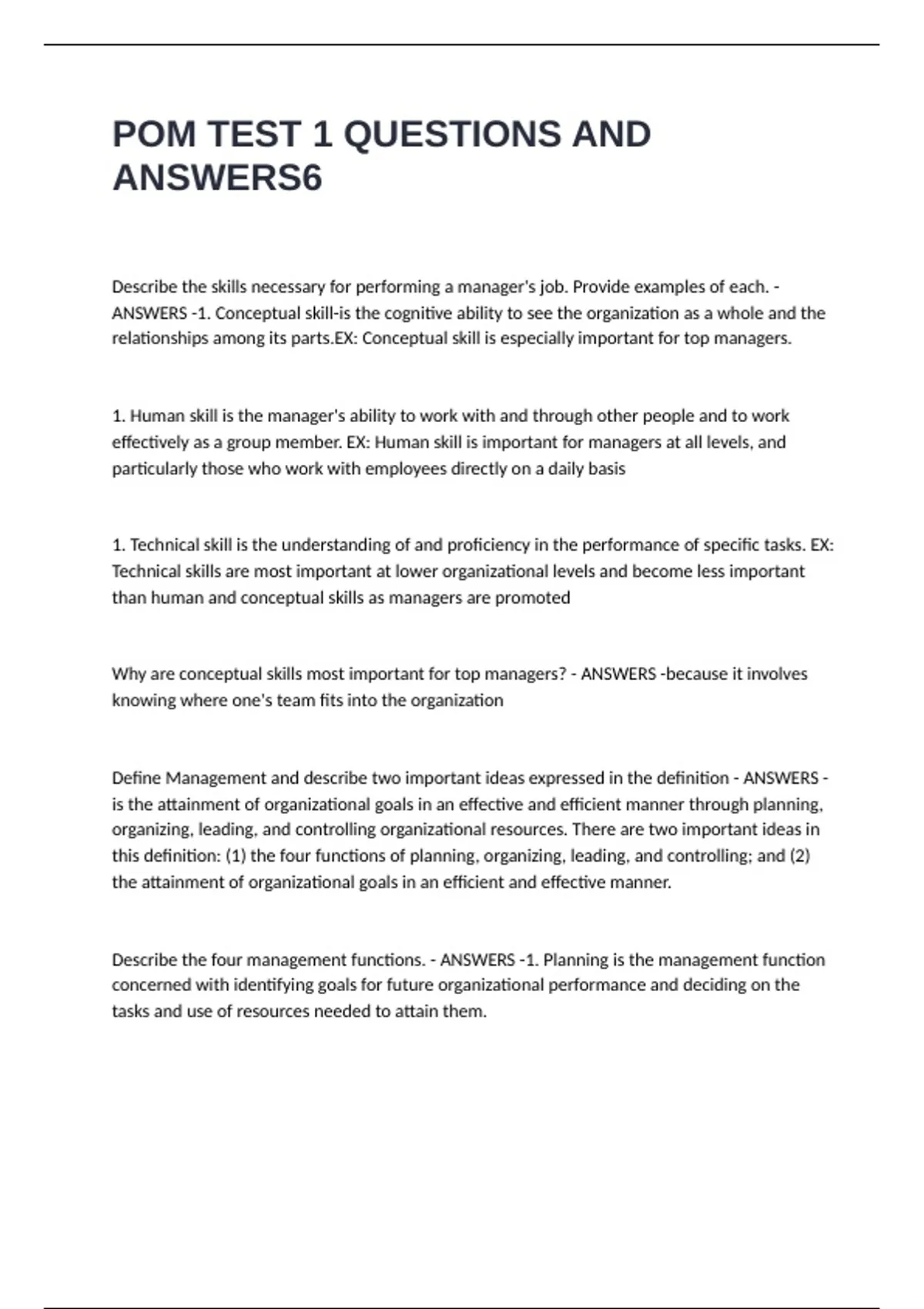 POM TEST 1 QUESTIONS AND ANSWERS Describe the skills necessary for performing a manager's job. Provide examples of each. - ANSWERS -1. Conceptual skill-is the cognitive ability to see the organization as a whole and the relationships among its parts.EX: Conceptual skill is especially important for top managers. 1. Human skill is the manager's ability to work with and through other people and to work effectively as a group member. EX: Human skill is important for managers at all levels, and particularly those who work with employees directly on a daily basis 1. Technical skill is the understanding of and proficiency in the performance of specific tasks. EX: Technical skills are most important at lower organizational levels and become less important than human and conceptual skills as managers are promoted Why are conceptual skills most important for top managers? - ANSWERS -because it involves knowing where one's team fits into the organization Define Management and describe two important ideas expressed in the definition - ANSWERS -is the attainment of organizational goals in an effective and efficient manner through planning, organizing, leading, and controlling organizational resources. There are two important ideas in this definition: (1) the four functions of planning, organizing, leading, and controlling; and (2) the attainment of organizational goals in an efficient and effective manner. Describe the four management functions. - ANSWERS -1. Planning is the management function concerned with identifying goals for future organizational performance and deciding on the tasks and use of resources needed to attain them.