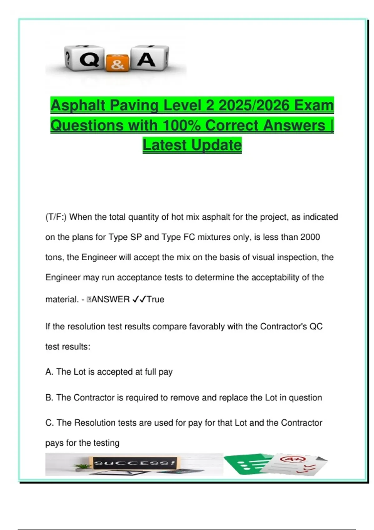 This document contains 100+ expertly answered exam questions for the Asphalt Paving Level 2 certification, based on FDOT (Florida Department of Transportation) 2025/2026 specifications. It is tailored for Civil Engineering, Transportation Engineering, Construction Management, and Public Infrastructure students and professionals who are preparing for state certification or engaged in public-sector roadway construction. Topics span critical areas of asphalt paving and mix production, including: Mix design specifications for SP, FC, and FC-5 mixes, with layer thickness and temperature requirements Quality Control (QC) and Verification (QA) protocols, including density testing, resolution procedures, and core comparison thresholds Tack and prime coat applications, acceptable materials, and temperature-adjusted spread rate calculations Equipment and technique-focused questions such as vibratory roller frequency, screed operations, joint matchers, and slope control during milling Compaction strategies, temperature timing, and understanding of field tolerances Advanced calculations on spread rate, tons-to-yards conversions, application rate verification, and Gmm density calculations Special attention is given to FDOT specifications, such as acceptance criteria under tonnage thresholds, lot size regulations, and automatic screed control types, making this a high-value resource for those working on Florida-based projects. Perfect for: FDOT Level 2 Certification candidates Civil and Construction Engineering students QC/QA technicians, paving foremen, and field inspectors Professionals handling public infrastructure projects, state road construction, and municipal paving contracts Keywords: FDOT Level 2, asphalt paving, compaction, mix design, tack rate, spread rate, FC-5, SP-12.5, PG76-22, Gmm, Gmb, density testing, QC verification, resolution test, truck bed requirements, screed controls, vibratory roller, application tolerance, layer thickness, joint matcher, slope checks, rubblization, structural layer correction, friction course, core layout, asphalt inspection, paving certification