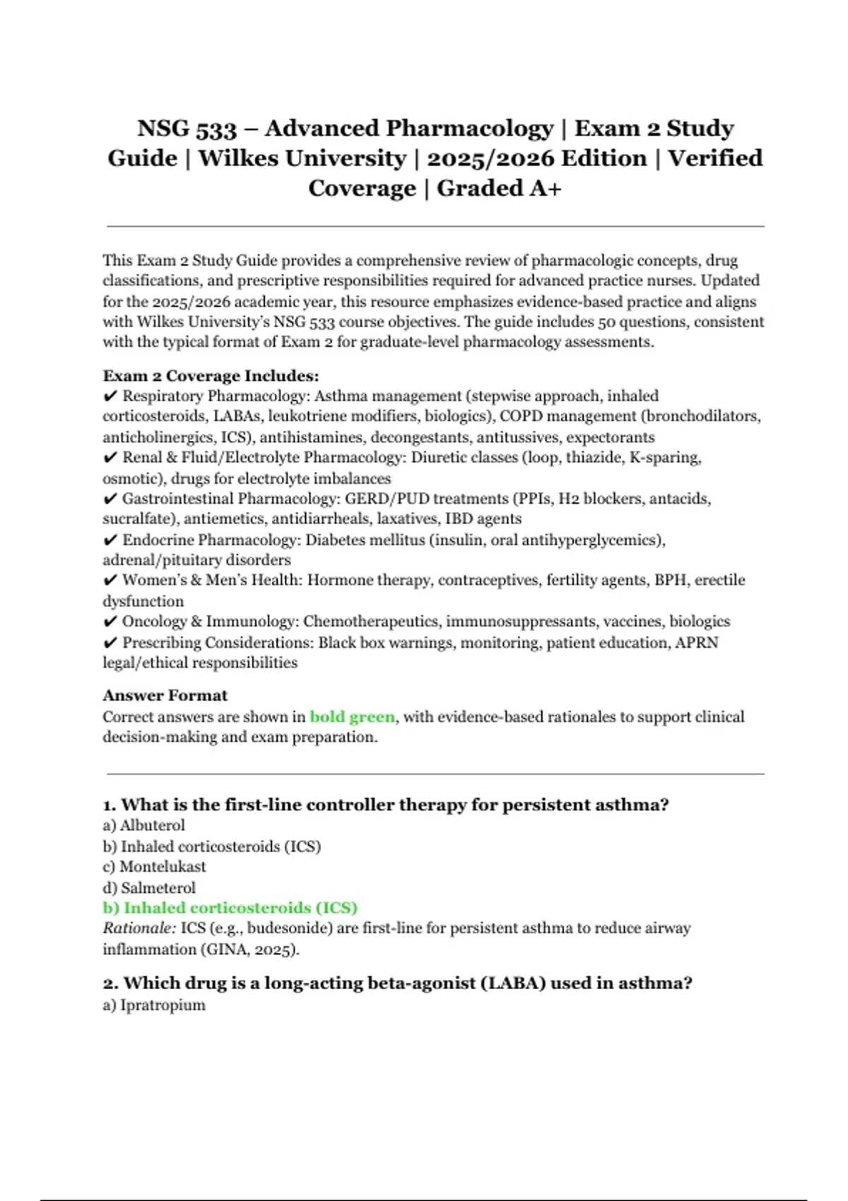 with Wilkes University’s NSG 533 course objectives. The guide includes 50 questions, consistent