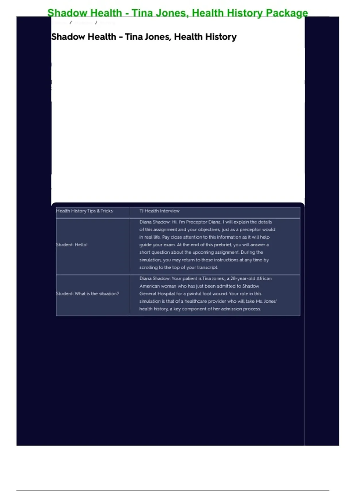 Shadow Health – Tina Jones Health History Package | 5 Merged Exams | Nursing Simulation & Patient Assessment | Complete Chapters Included