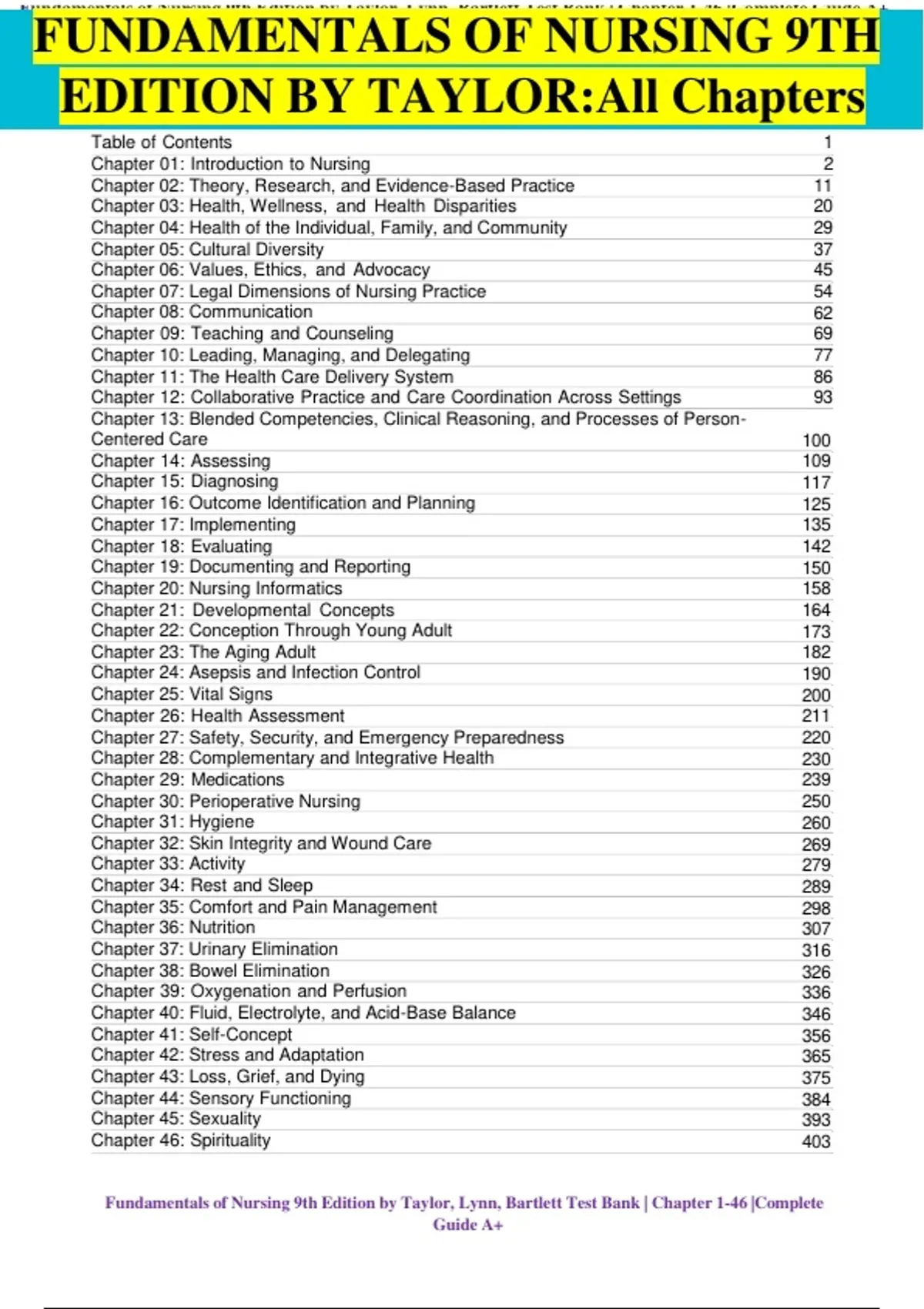 , Fundamentals of Nursing 9th Edition by Taylor, Lynn, Bartlett Test Bank | Chapter 1-46 |Complete Guide A+