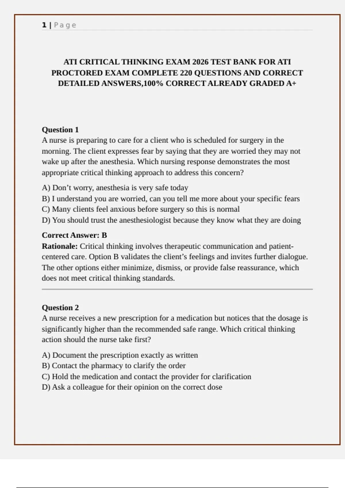ATI CRITICAL THINKING EXAM 2026 TEST BANK FOR ATI