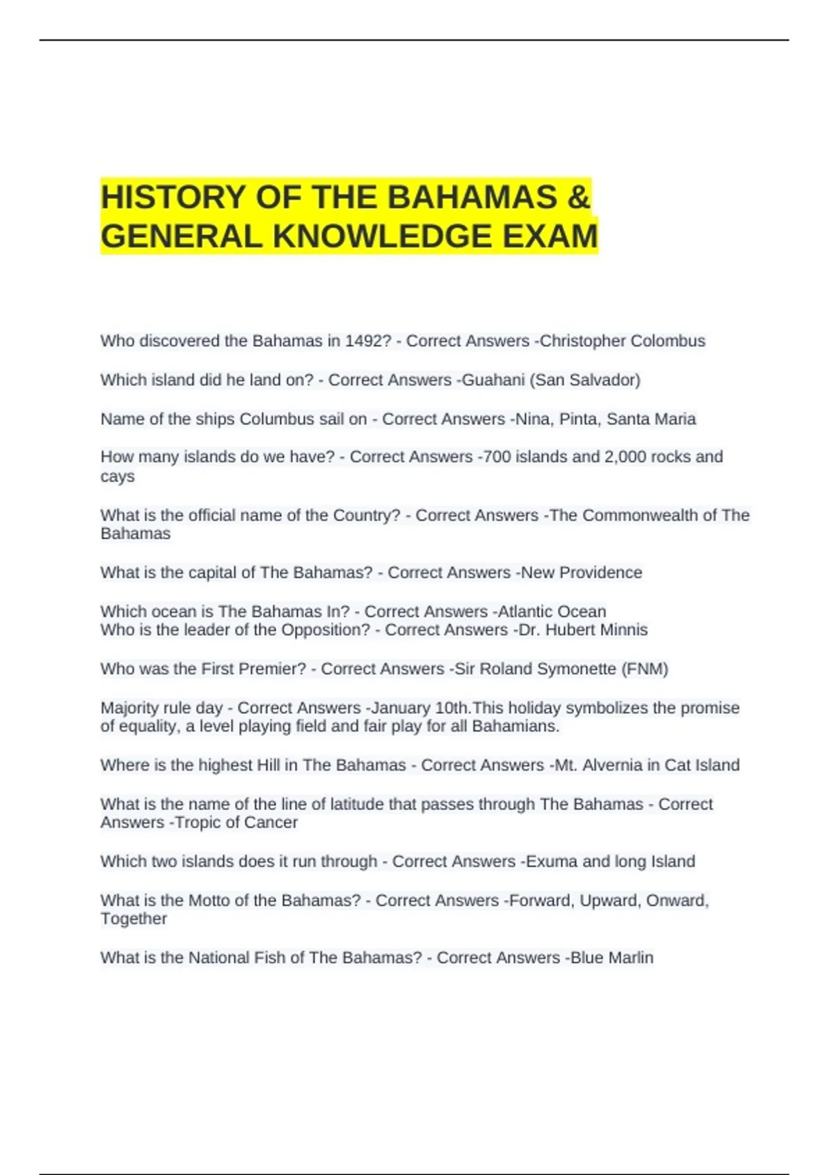 HISTORY OF THE BAHAMAS & GENERAL KNOWLEDGE EXAM QUESTIONS AND ANSWERS | GRADED A
