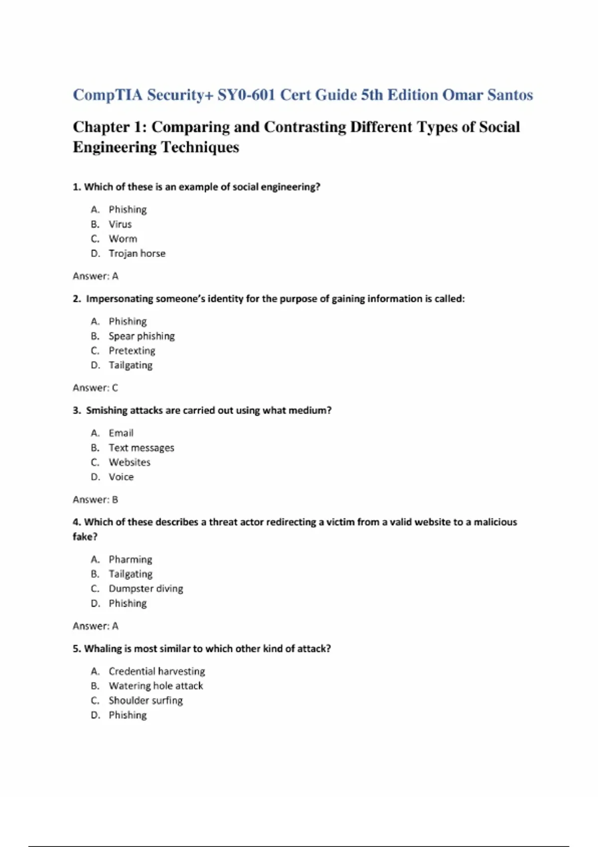 The Test Bank for CompTIA Security+ SY0-601 Cert Guide, 5th Edition by Omar Santos, Ron Taylor, and Joseph Mlodzianowski delivers a full suite of exam-style questions aligned with every chapter of the textbook. It includes multiple-choice, true/false, scenario, matching, and short answer items, each keyed to section objectives to support quizzes, midterms, review tests, and final exams. This Test Bank follows the official chapter structure of the Cert Guide. The chapters covered begin with Chapter 1: Comparing and Contrasting Different Types of Social Engineering Techniques, then Chapter 2: Analyzing Potential Indicators to Determine the Type of Attack, Chapter 3: Exploiting the Attack Surface Through Vulnerabilities, Chapter 4: Securing the Architecture and Design, Chapter 5: Implementing Secure Network Architecture Concepts, Chapter 6: Summarizing the Techniques Used in Security Assessments, Chapter 7: Understanding the Security Concerns Associated with Various Types of Vulnerabilities, Chapter 8: Summarizing Virtualization and Cloud Computing Concepts, Chapter 9: Summarizing the Concepts of Identity and Access Management, Chapter 10: Summarizing Authentication and Authorization Methods, Chapter 11: Implementing Secure Protocols, Chapter 12: Implementing Host or Application Security Solutions, Chapter 13: Implementing Secure Network Designs, Chapter 14: Implementing Secure Wireless Solutions, Chapter 15: Understanding the Importance of Physical Security Controls, Chapter 16: Summarizing the Basics of Cryptographic Concepts, Chapter 17: Implementing Secure Protocols, Chapter 18: Implementing Host or Application Security, Chapter 19: Implementing Secure Network Designs, Chapter 20: Installing and Configuring Wireless Security Settings, with Appendix B: Cert Guide Exam Updates, Appendix C: Study Planner, and more supplemental content.