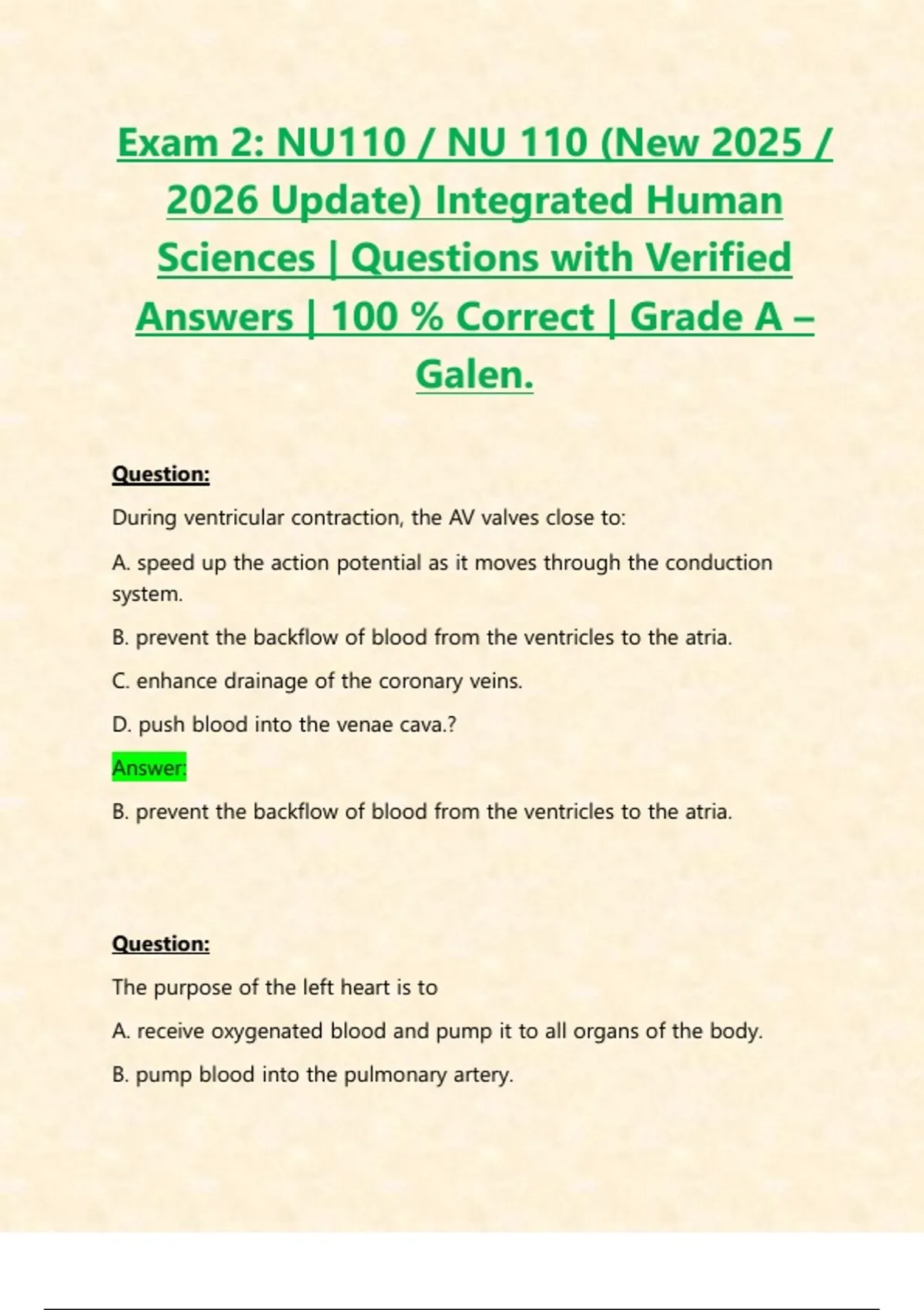 Exam 2: NU110 / NU 110 (New 2025 / 2026 Update) Integrated Human Sciences | Questions with Verified Answers | 100 % Correct | Grade A – Galen.