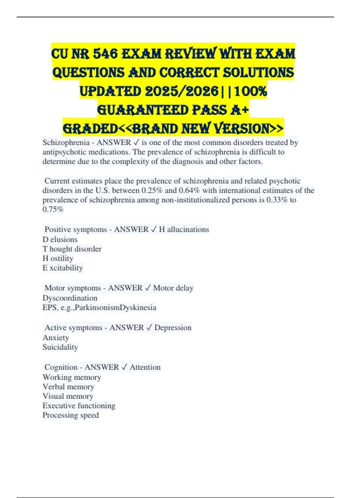 CU NR 546 Exam Review with Exam Questions and Correct Solutions Updated 2025/2026||100% Guaranteed Pass A+ GRADED&lt;&lt;BRAND NEW VERSION&gt;&gt; Schizophrenia - ANSWER is one of the most common disorders treated by antipsychotic medications. The prevalence of schizophrenia is difficult to determine due to the complexity of the diagnosis and other factors. Current estimates place the prevalence of schizophrenia and related psychotic disorders in the U.S. between 0.25% and 0.64% with international estimates of the prevalence of schizophrenia among non-institutionalized persons is 0.33% to 0.75% Positive symptoms - ANSWER H allucinations D elusions T hought disorder H ostility E xcitability Motor symptoms - ANSWER Motor delay Dyscoordination EPS, e.g.,ParkinsonismDyskinesia Active symptoms - ANSWER Depression Anxiety Suicidality Cognition - ANSWER Attention Working memory Verbal memory Visual memory Executive functioning Processing speed Social conditioning Negative symptoms - ANSWER Affective flattening Alogia Anhedonia Amotivation Asociality Genetics - ANSWER Many genes play a role in the likelihood that an individual will develop schizophrenia as do epigenetic factors. Heritability for schizophrenia may be as high as 79% . Evidence exists that links gene-environment interaction to the diagnosis of schizophrenia Environmental Triggers - ANSWER Regular Cannabis Use Exposure to Early Life Trauma Sexual Abuse Emotional Abuse Emotional Neglect Bullying Neuroanatomy - ANSWER Several areas of the brain are associated with the symptoms of schizophrenia. When brain circuitry in the prefrontal cortex malfunctions, patients may experience symptoms. Mesocortical and ventromedial prefrontal cortex - ANSWER negative and affective symptoms Dorsolateral: - ANSWER cognitive symptoms
