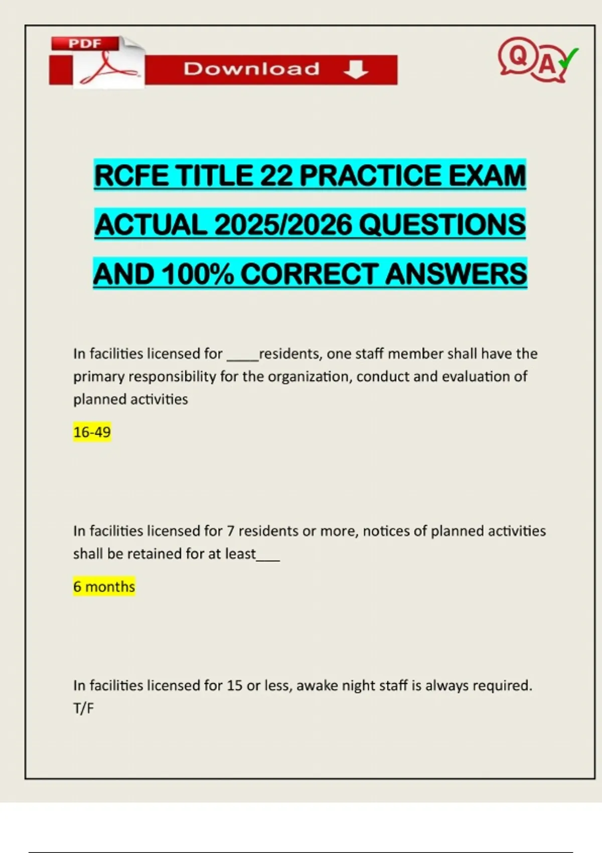 RCFE TITLE 22 PRACTICE EXAM ACTUAL 2025/2026 QUESTIONS AND 100% CORRECT ANSWERS