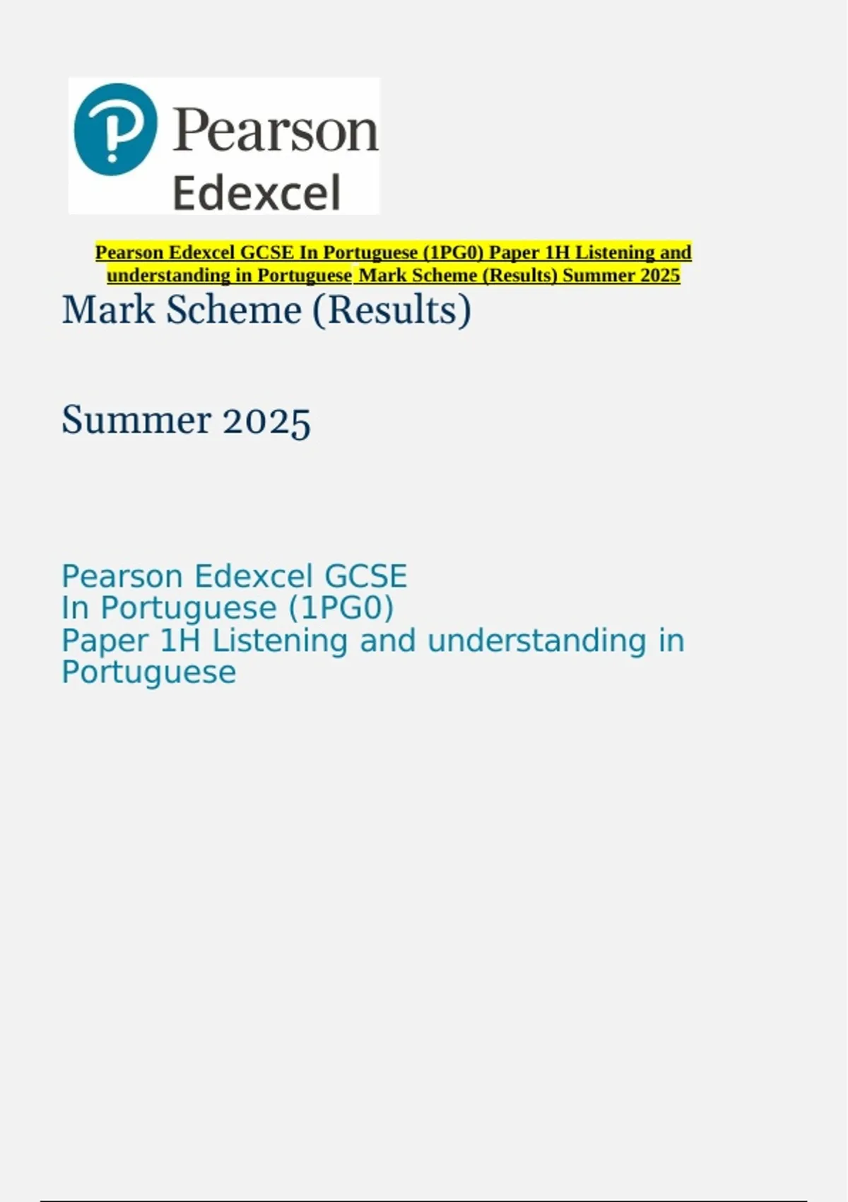 Pearson Edexcel GCSE In Portuguese (1PG0) Paper 1H Listening and understanding in Portuguese Mark Scheme (Results) Summer 2025