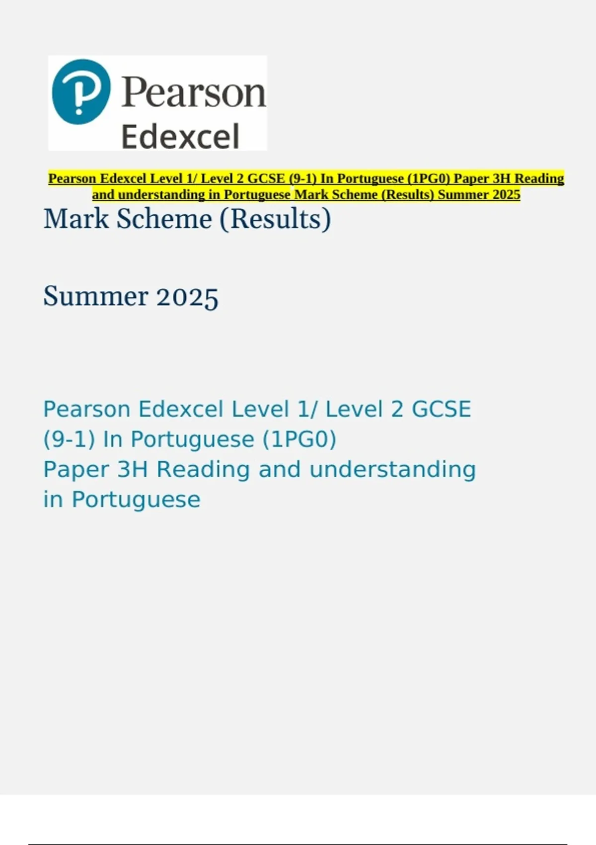 Pearson Edexcel Level 1/ Level 2 GCSE (9-1) In Portuguese (1PG0) Paper 3H Reading and understanding in Portuguese Mark Scheme (Results) Summer 2025
