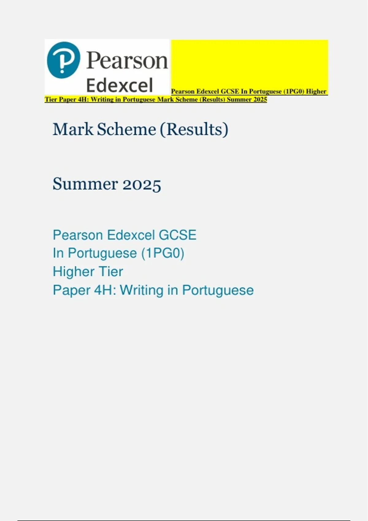 Tier Paper 4H: Writing in Portuguese Mark Scheme (Results) Summer 2025