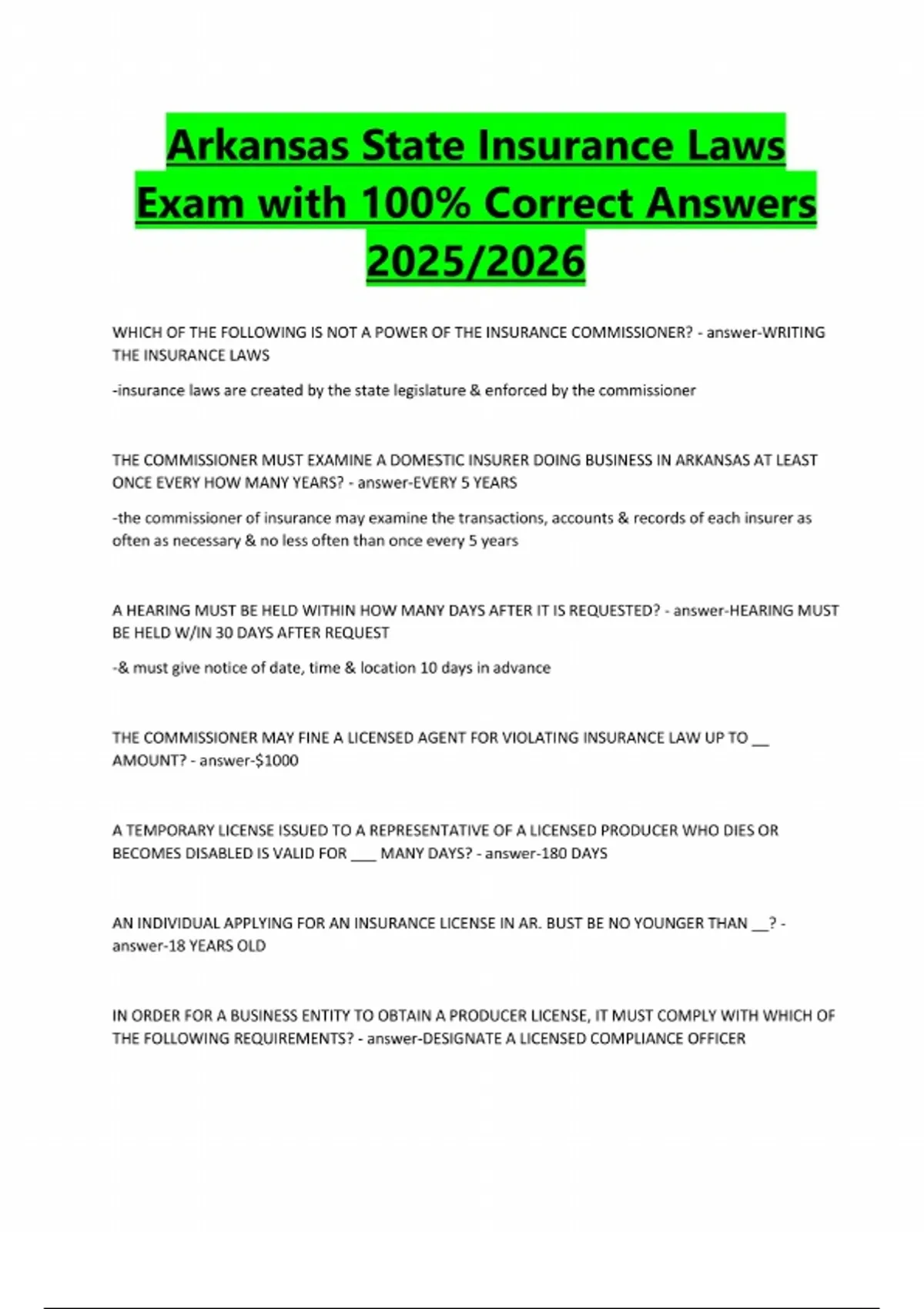 Arkansas State Insurance Laws Exam with 100% Correct Answers 2025/2026 WHICH OF THE FOLLOWING IS NOT A POWER OF THE INSURANCE COMMISSIONER? - answer-WRITING THE INSURANCE LAWS -insurance laws are created by the state legislature & enforced by the commissioner THE COMMISSIONER MUST EXAMINE A DOMESTIC INSURER DOING BUSINESS IN ARKANSAS AT LEAST ONCE EVERY HOW MANY YEARS? - answer-EVERY 5 YEARS -the commissioner of insurance may examine the transactions, accounts & records of each insurer as often as necessary & no less often than once every 5 years A HEARING MUST BE HELD WITHIN HOW MANY DAYS AFTER IT IS REQUESTED? - answer-HEARING MUST BE HELD W/IN 30 DAYS AFTER REQUEST -& must give notice of date, time & location 10 days in advance THE COMMISSIONER MAY FINE A LICENSED AGENT FOR VIOLATING INSURANCE LAW UP TO __ AMOUNT? - answer-$1000 A TEMPORARY LICENSE ISSUED TO A REPRESENTATIVE OF A LICENSED PRODUCER WHO DIES OR BECOMES DISABLED IS VALID FOR ___ MANY DAYS? - answer-180 DAYS AN INDIVIDUAL APPLYING FOR AN INSURANCE LICENSE IN AR. BUST BE NO YOUNGER THAN __? - answer-18 YEARS OLD IN ORDER FOR A BUSINESS ENTITY TO OBTAIN A PRODUCER LICENSE, IT MUST COMPLY WITH WHICH OF THE FOLLOWING REQUIREMENTS? - answer-DESIGNATE A LICENSED COMPLIANCE OFFICER
