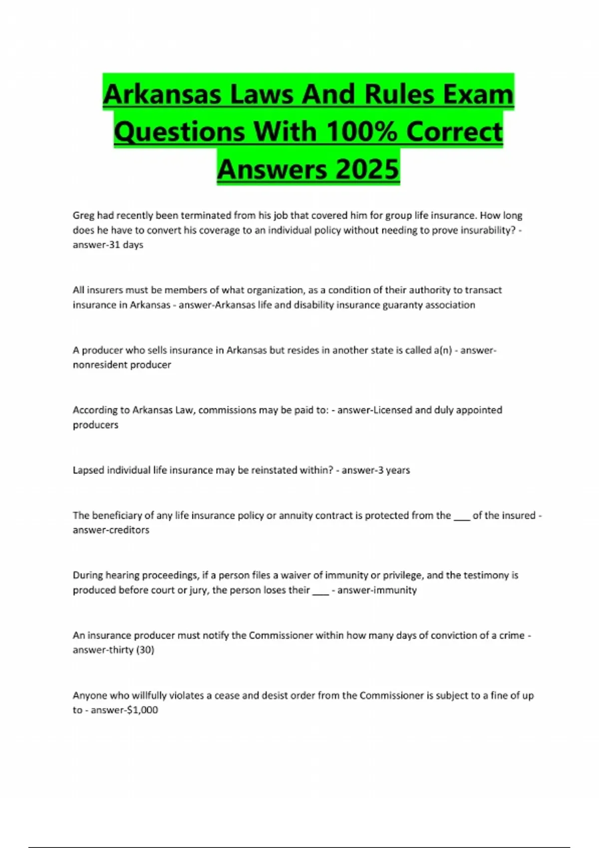 Arkansas Laws And Rules Exam Questions With 100% Correct Answers 2025 Greg had recently been terminated from his job that covered him for group life insurance. How long does he have to convert his coverage to an individual policy without needing to prove insurability? - answer-31 days All insurers must be members of what organization, as a condition of their authority to transact insurance in Arkansas - answer-Arkansas life and disability insurance guaranty association A producer who sells insurance in Arkansas but resides in another state is called a(n) - answernonresident producer According to Arkansas Law, commissions may be paid to: - answer-Licensed and duly appointed producers Lapsed individual life insurance may be reinstated within? - answer-3 years The beneficiary of any life insurance policy or annuity contract is protected from the ___ of the insured - answer-creditors During hearing proceedings, if a person files a waiver of immunity or privilege, and the testimony is produced before court or jury, the person loses their ___ - answer-immunity An insurance producer must notify the Commissioner within how many days of conviction of a crime - answer-thirty (30) Anyone who willfully violates a cease and desist order from the Commissioner is subject to a fine of up to - answer-$1,000which of the following constitutes grounds for suspending an Arkansas producer's license - answerFelony conviction which is the best way to describe controlled business - answer-Policies written on people that a producer has influences over Maria the insurance producer completes a sale by collecting the required signatures on the applications and obtaining the initial premium. Afterwards, she deposits the checks into her personal checking account. Maria has committed what crime? - answer-fraud