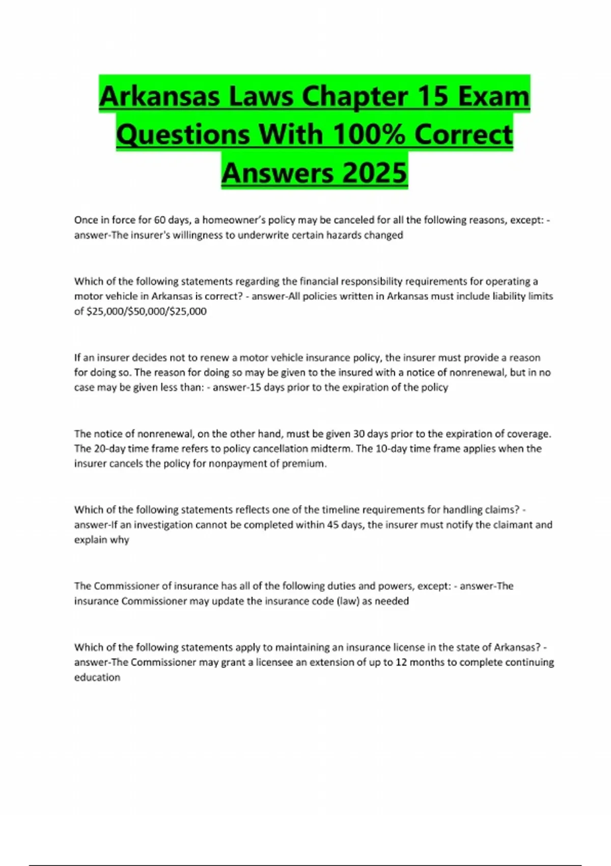 Arkansas Laws Chapter 15 Exam Questions With 100% Correct Answers 2025 Once in force for 60 days, a homeowner’s policy may be canceled for all the following reasons, except: - answer-The insurer's willingness to underwrite certain hazards changed Which of the following statements regarding the financial responsibility requirements for operating a motor vehicle in Arkansas is correct? - answer-All policies written in Arkansas must include liability limits of $25,000/$50,000/$25,000 If an insurer decides not to renew a motor vehicle insurance policy, the insurer must provide a reason for doing so. The reason for doing so may be given to the insured with a notice of nonrenewal, but in no case may be given less than: - answer-15 days prior to the expiration of the policy The notice of nonrenewal, on the other hand, must be given 30 days prior to the expiration of coverage. The 20-day time frame refers to policy cancellation midterm. The 10-day time frame applies when the insurer cancels the policy for nonpayment of premium. Which of the following statements reflects one of the timeline requirements for handling claims? - answer-If an investigation cannot be completed within 45 days, the insurer must notify the claimant and explain why The Commissioner of insurance has all of the following duties and powers, except: - answer-The insurance Commissioner may update the insurance code (law) as needed Which of the following statements apply to maintaining an insurance license in the state of Arkansas? - answer-The Commissioner may grant a licensee an extension of up to 12 months to complete continuing educationWhich of the following statements regarding the Arkansas Rural Risk Underwriting Association is correct? - answer-The Association sets rules for risks classification, rate modification and coverage limits Making a false statement regarding the financial condition of a person with intent to deceive is defined as: - answer-False Financial Statements Which of the following policy standards is false according to Arkansas law? - answer-Insureds must be notified of any premium increases 30 days in advance