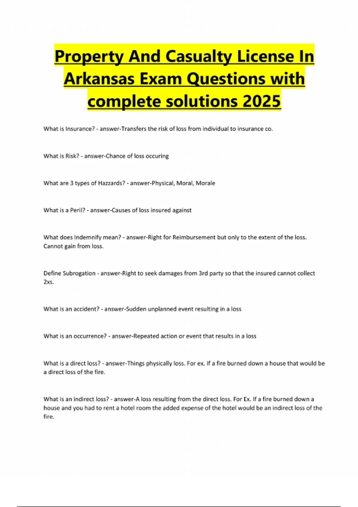 Property And Casualty License In Arkansas Exam Questions with complete solutions 2025 What is Insurance? - answer-Transfers the risk of loss from individual to insurance co. What is Risk? - answer-Chance of loss occuring What are 3 types of Hazzards? - answer-Physical, Moral, Morale What is a Peril? - answer-Causes of loss insured against What does Indemnify mean? - answer-Right for Reimbursement but only to the extent of the loss. Cannot gain from loss. Define Subrogation - answer-Right to seek damages from 3rd party so that the insured cannot collect 2xs. What is an accident? - answer-Sudden unplanned event resulting in a loss What is an occurrence? - answer-Repeated action or event that results in a loss What is a direct loss? - answer-Things physically loss. For ex. If a fire burned down a house that would be a direct loss of the fire. What is an indirect loss? - answer-A loss resulting from the direct loss. For Ex. If a fire burned down a house and you had to rent a hotel room the added expense of the hotel would be an indirect loss of the fire.What is a vacancy? - answer-When someone has been absent and no property is stored on the premises for 60 days consecutively. What is unoccupied? - answer-When someone has been absent from the premises for more than 60 consecutive days but still has property stored there. What type of insurance provides coverage for multiple classes of property at one location? - answerBlanket Insurance Explain the actual cash value method of valuation - answer-Current replacement cost-depreciation = ACV When absolute liability is involved, does the injured party have to prove negligence? - answer-No If a product is unsafe, what kind of liability applies to the manufacturer. - answer-Strict liability What is proximate cause? - answer-A reasonable cause or reason why a loss occurred.