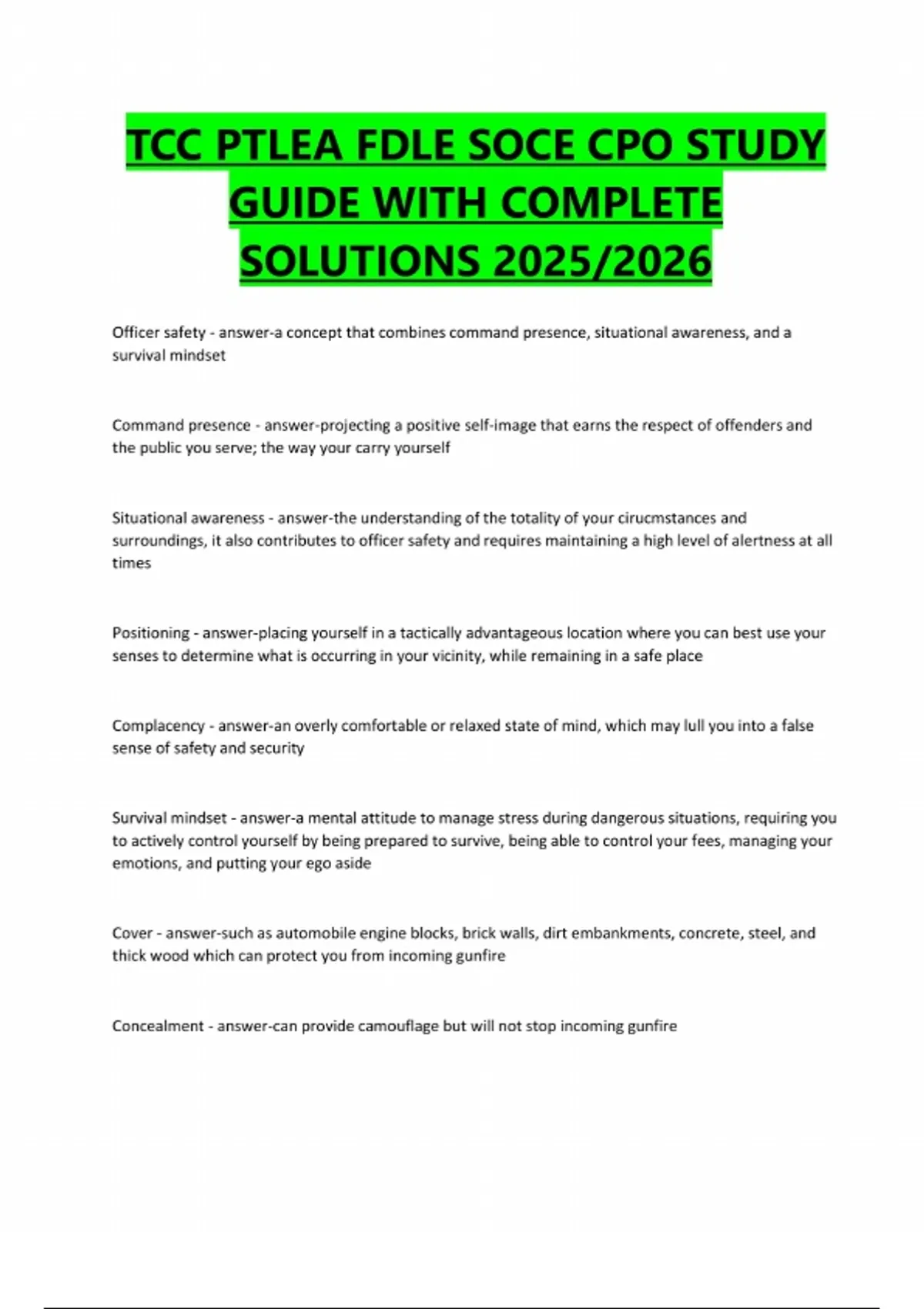 TCC PTLEA FDLE SOCE CPO STUDY GUIDE WITH COMPLETE SOLUTIONS 2025/2026 Officer safety - answer-a concept that combines command presence, situational awareness, and a survival mindset Command presence - answer-projecting a positive self-image that earns the respect of offenders and the public you serve; the way your carry yourself Situational awareness - answer-the understanding of the totality of your cirucmstances and surroundings, it also contributes to officer safety and requires maintaining a high level of alertness at all times Positioning - answer-placing yourself in a tactically advantageous location where you can best use your senses to determine what is occurring in your vicinity, while remaining in a safe place Complacency - answer-an overly comfortable or relaxed state of mind, which may lull you into a false sense of safety and security Survival mindset - answer-a mental attitude to manage stress during dangerous situations, requiring you to actively control yourself by being prepared to survive, being able to control your fees, managing your emotions, and putting your ego aside Cover - answer-such as automobile engine blocks, brick walls, dirt embankments, concrete, steel, and thick wood which can protect you from incoming gunfire Concealment - answer-can provide camouflage but will not stop incoming gunfireCommunity-policing - answer-promotes organizational strategies that support the systemic use of partnerships and problem-solving techniques to proactively address public safety issues such as crime, social disorder, and fear of crime Organizational Transformation - answer-the orientation of command staff at all levels to support community partnerships and practice problem-solving Community-policing problem solving - answer-the proactive examination of community problems to develop and evaluate effective criminal justice responses