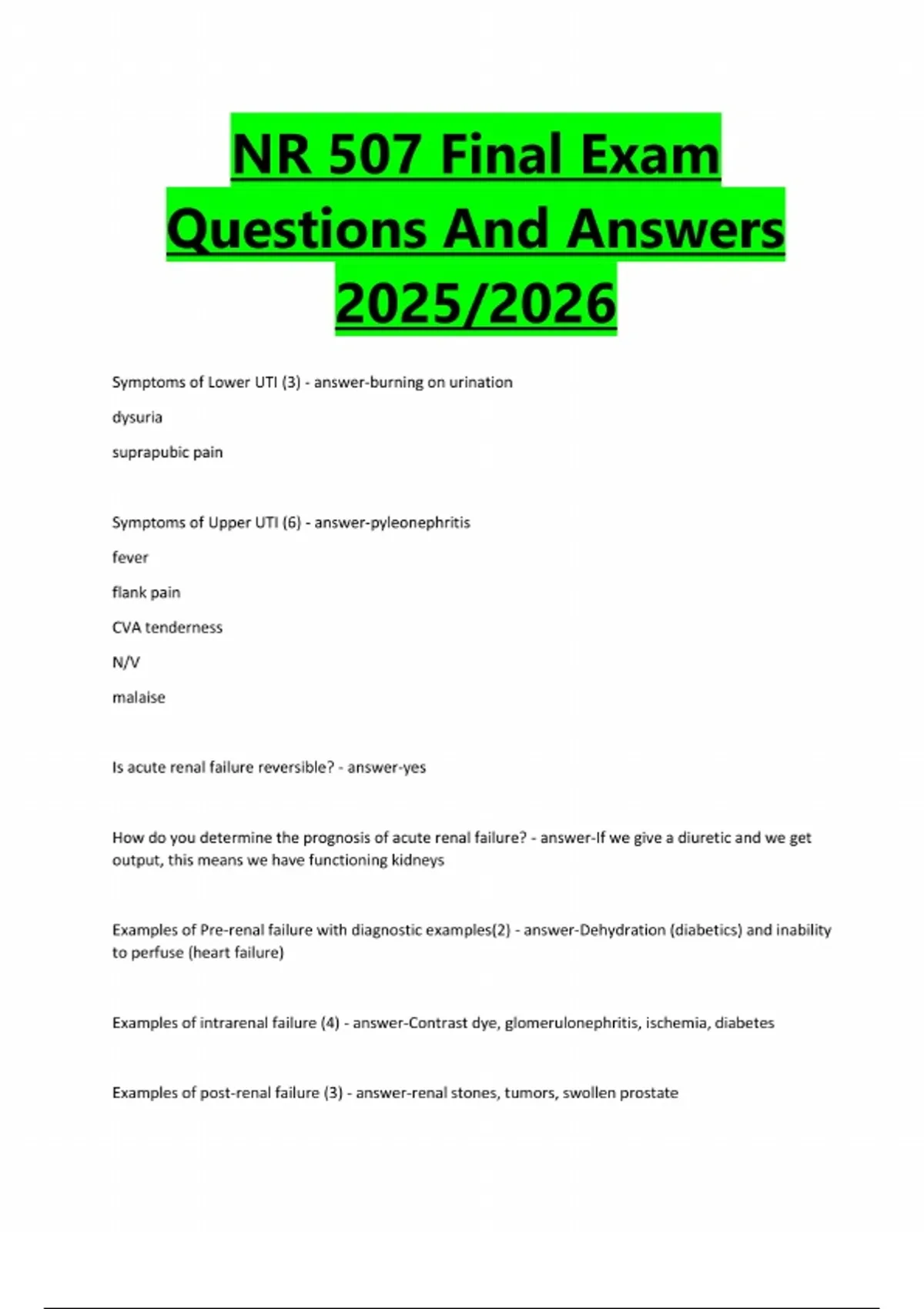 NR 507 Final Exam Questions And Answers 2025/2026 Symptoms of Lower UTI (3) - answer-burning on urination dysuria suprapubic pain Symptoms of Upper UTI (6) - answer-pyleonephritis fever flank pain CVA tenderness N/V malaise Is acute renal failure reversible? - answer-yes How do you determine the prognosis of acute renal failure? - answer-If we give a diuretic and we get output, this means we have functioning kidneys Examples of Pre-renal failure with diagnostic examples(2) - answer-Dehydration (diabetics) and inability to perfuse (heart failure) Examples of intrarenal failure (4) - answer-Contrast dye, glomerulonephritis, ischemia, diabetes Examples of post-renal failure (3) - answer-renal stones, tumors, swollen prostateKey diagnostic test result for acute pyelonephritis - answer-WBC casts What type of renal failure are renal calculi? - answer-Post renal Gold standard of diagnosing renal calculi? - answer-CT scan Treatment goals for renal calculi (4) - answer-pain management, pass stone, reduce size of stone, prevent new stones Who is a candidate for dialysis? (5) - answer-Unresolvable hyperkalemia, acidosis, uremic symptoms, fluid overload resistant to therapy, stage 5 CKD