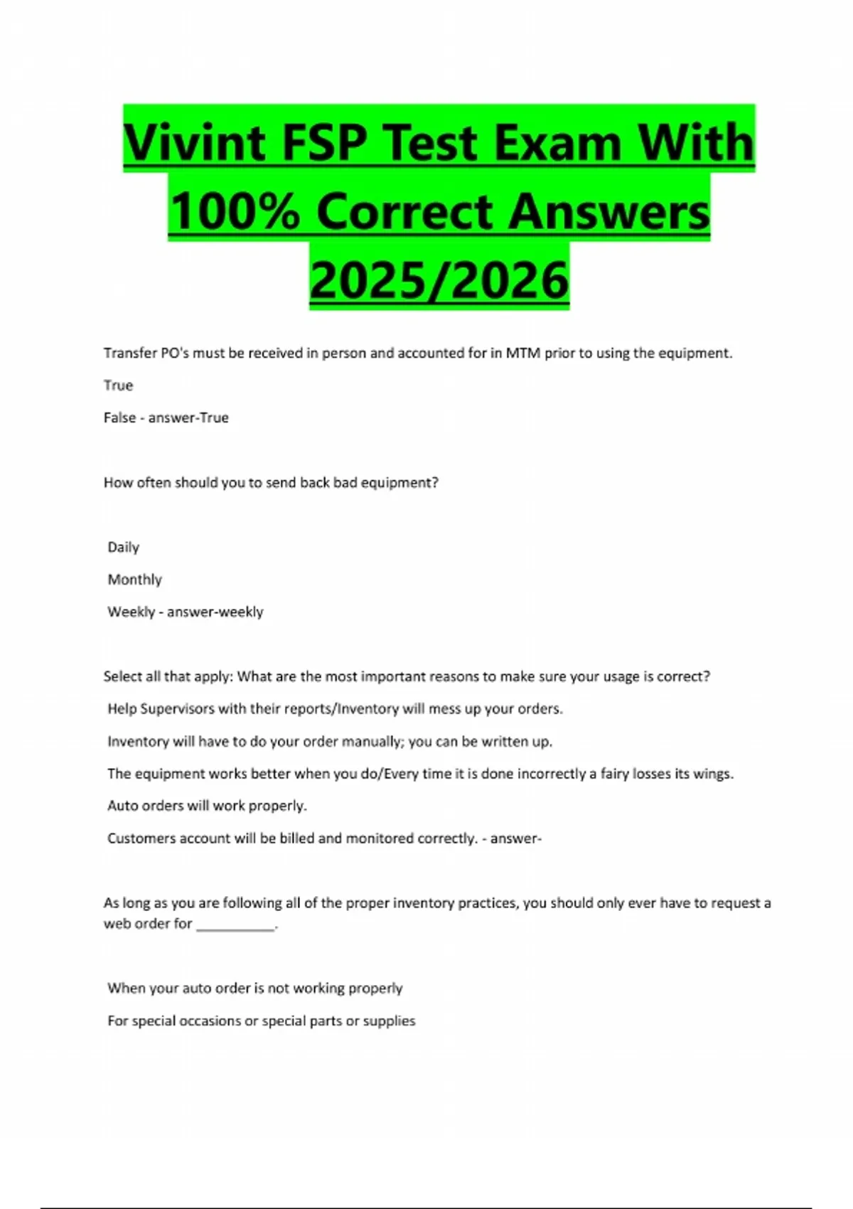Vivint FSP Test Exam With 100% Correct Answers 2025/2026 Transfer PO's must be received in person and accounted for in MTM prior to using the equipment. True False - answer-True How often should you to send back bad equipment? Daily Monthly Weekly - answer-weekly Select all that apply: What are the most important reasons to make sure your usage is correct? Help Supervisors with their reports/Inventory will mess up your orders. Inventory will have to do your order manually; you can be written up. The equipment works better when you do/Every time it is done incorrectly a fairy losses its wings. Auto orders will work properly. Customers account will be billed and monitored correctly. - answerAs long as you are following all of the proper inventory practices, you should only ever have to request a web order for __________. When your auto order is not working properly For special occasions or special parts or suppliesVIP customers None of the above - answer-For special occasions or special parts or supplies Who do you contact if you did not receive the correct amount of equipment in your order? Inventory Control Order Processing Inventory Queue Inventory Supervisors None of the above - answer-order processing If you do not know how to perform any of these tasks, or are not fully confident in how to accomplish them, who should you first contact? And where can you acquire this written information? Fellow FSP and Inventory Regional Manager and FSpro FSM and KIM - answer-Regional Manager and FSpro Your on-hand number will change when you receive a transfer PO. True False - answer-True Your on-hand number will change when you create a Web Order PO. True False - answer-false