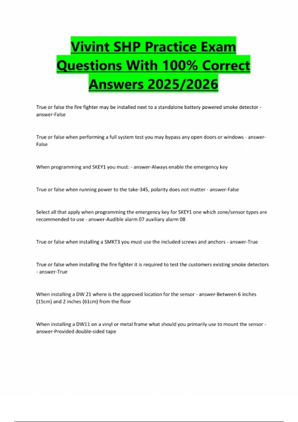 Vivint SHP Practice Exam Questions With 100% Correct Answers 2025/2026 True or false the fire fighter may be installed next to a standalone battery powered smoke detector - answer-False True or false when performing a full system test you may bypass any open doors or windows - answerFalse When programming and SKEY1 you must: - answer-Always enable the emergency key True or false when running power to the take-345, polarity does not matter - answer-False Select all that apply when programming the emergency key for SKEY1 one which zone/sensor types are recommended to use - answer-Audible alarm 07 auxiliary alarm 08 True or false when installing a SMKT3 you must use the included screws and anchors - answer-True True or false when installing the fire fighter it is required to test the customers existing smoke detectors - answer-True When installing a DW 21 where is the approved location for the sensor - answer-Between 6 inches (15cm) and 2 inches (61cm) from the floor When installing a DW11 on a vinyl or metal frame what should you primarily use to mount the sensor - answer-Provided double-sided tapeSelect all that apply which of the following materials can you use to group multiple ground terminals in the takeover module - answer-B connectors/beans and Wire caps Which of the following sensors are not allowed to program using a translator - answer-Smoke detector True or false when installing the take 345 you must always test the new 12 V battery before using it - answer-True What is the output voltage of the transformer used to power the Smart hub - answer-12 VDC What is the minimum distance for placement of a CO3 from the corners on a wall - answer-12 inches (30 cm) True or false the SMK3 has only two functions: smoke and heat detection - answer-False