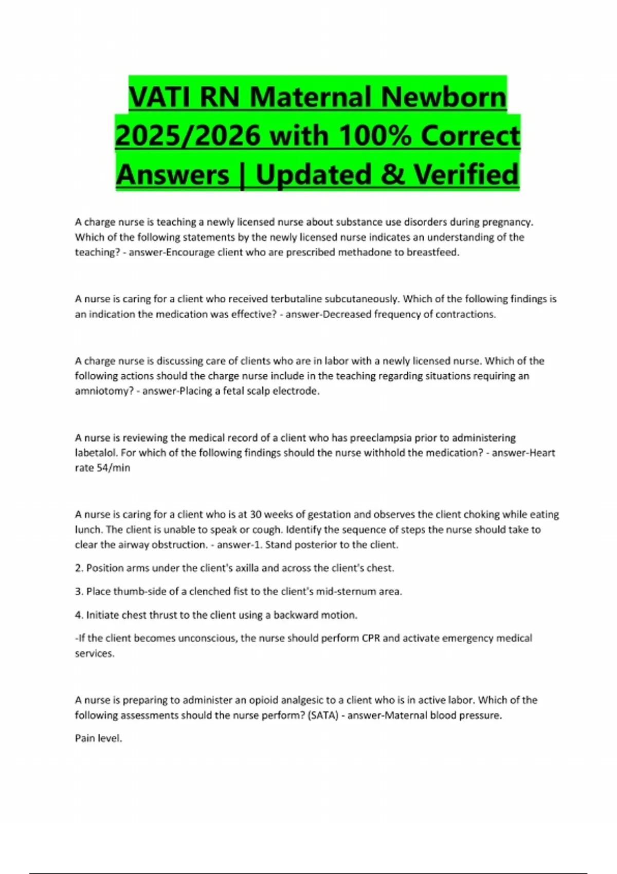 VATI RN Maternal Newborn 2025/2026 with 100% Correct Answers | Updated & Verified A charge nurse is teaching a newly licensed nurse about substance use disorders during pregnancy. Which of the following statements by the newly licensed nurse indicates an understanding of the teaching? - answer-Encourage client who are prescribed methadone to breastfeed. A nurse is caring for a client who received terbutaline subcutaneously. Which of the following findings is an indication the medication was effective? - answer-Decreased frequency of contractions. A charge nurse is discussing care of clients who are in labor with a newly licensed nurse. Which of the following actions should the charge nurse include in the teaching regarding situations requiring an amniotomy? - answer-Placing a fetal scalp electrode. A nurse is reviewing the medical record of a client who has preeclampsia prior to administering labetalol. For which of the following findings should the nurse withhold the medication? - answer-Heart rate 54/min A nurse is caring for a client who is at 30 weeks of gestation and observes the client choking while eating lunch. The client is unable to speak or cough. Identify the sequence of steps the nurse should take to clear the airway obstruction. - answer-1. Stand posterior to the client. 2. Position arms under the client's axilla and across the client's chest. 3. Place thumb-side of a clenched fist to the client's mid-sternum area. 4. Initiate chest thrust to the client using a backward motion. -If the client becomes unconscious, the nurse should perform CPR and activate emergency medical services. A nurse is preparing to administer an opioid analgesic to a client who is in active labor. Which of the following assessments should the nurse perform? (SATA) - answer-Maternal blood pressure. Pain level.Fetal heart rate. A nurse is reviewing the medical records of a client who is at 8 wks. of gestation. Which of the following findings should the nurse identify as a risk factor for developing preeclampsia? - answer-Rheumatoid Arthritis. A nurse is reviewing the laboratory results for a postpartum client who is receiving warfarin for deepvein thrombosis. Which of the following laboratory tests should the nurse monitor? - answerInternational normalized ratio (INR)