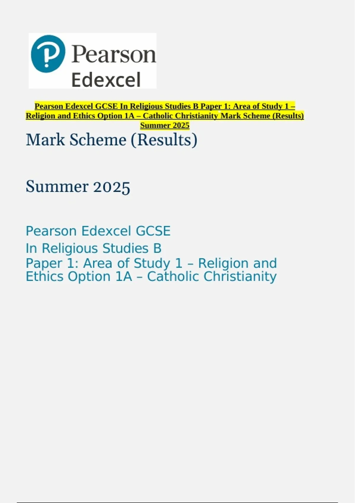 Religion and Ethics Option 1A – Catholic Christianity Mark Scheme (Results)