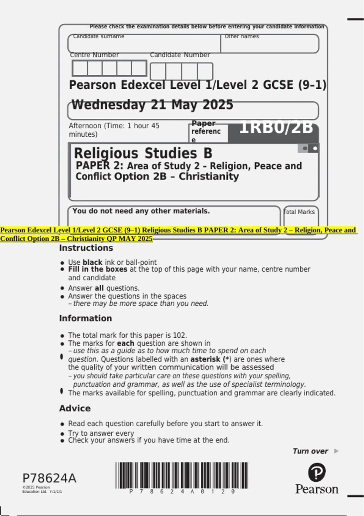 Pearson Edexcel Level 1/Level 2 GCSE (9–1) Religious Studies B PAPER 2: Area of Study 2 – Religion, Peace and