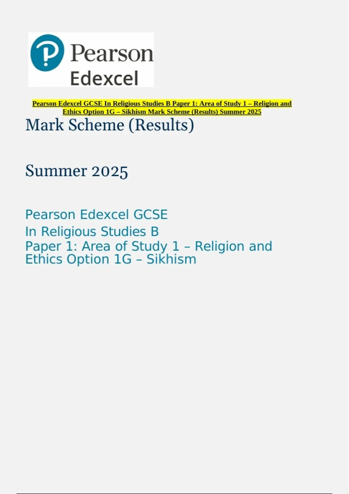 Ethics Option 1G – Sikhism Mark Scheme (Results) Summer 2025