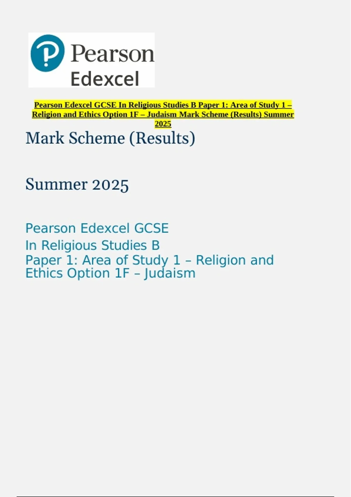 Religion and Ethics Option 1F – Judaism Mark Scheme (Results) Summer