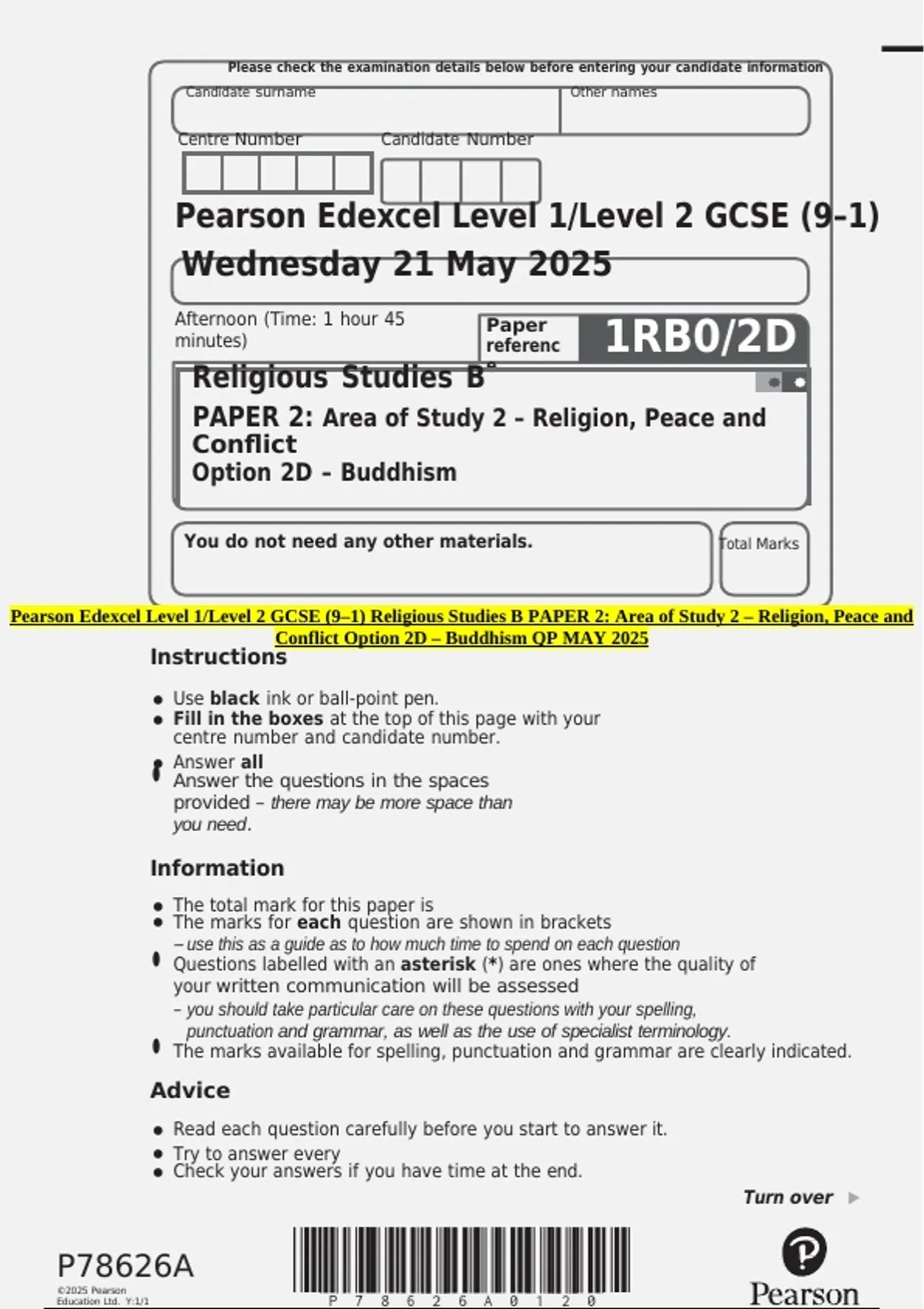 Pearson Edexcel Level 1/Level 2 GCSE (9–1) Religious Studies B PAPER 2: Area of Study 2 – Religion, Peace and