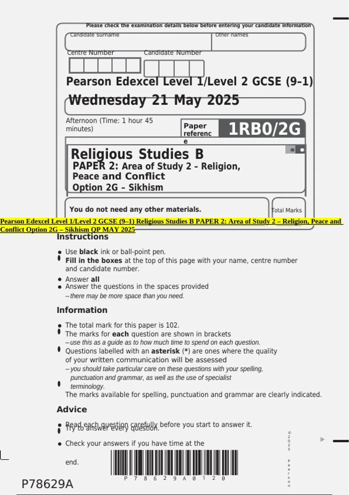 Conflict Option 2G – Sikhism QP MAY 2025