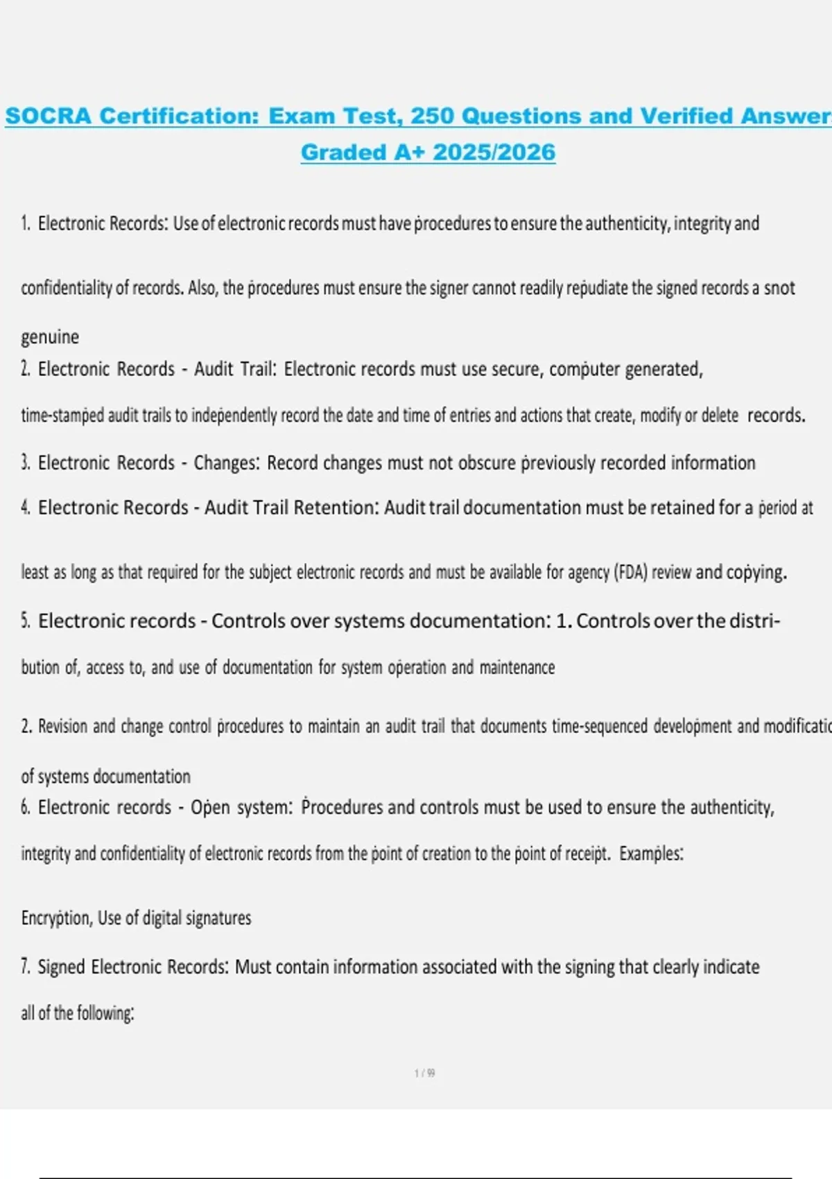 This document includes 250 exam test questions with verified answers for the SOCRA (Society of Clinical Research Associates) certification, fully updated for the 2025/2026 exam cycle. All answers are graded A+, ensuring accuracy and reliability for exam preparation. Covering essential areas of clinical research, regulations, and ethics, this resource provides comprehensive support for candidates aiming to pass the SOCRA certification exam with confidence.